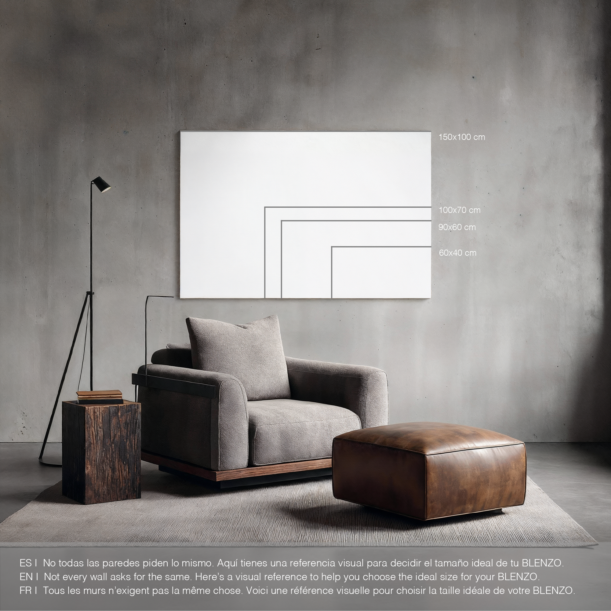 The canvas is hand-mounted on a 3.5cm thick pine wood frame , stretched and stapled with precision to ensure a flawless surface. The hanging system is discreetly integrated into the back , using a perimeter slot that allows for clean, quick, and hassle-free hanging. Simply insert the anchors... ¡And hang your Blenzo!