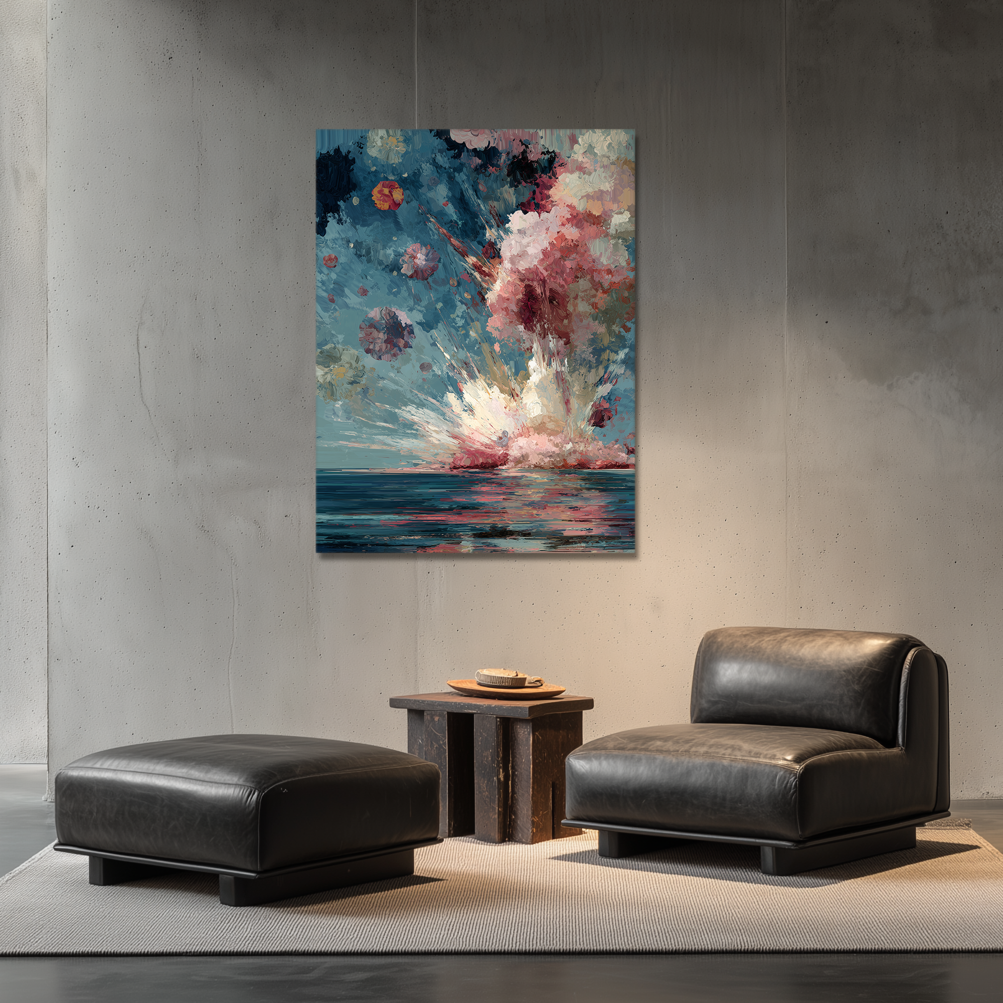 A chromatic explosion rises from the sea like an abstract floral blast. The painterly motion and rich palette generate an atmosphere that merges the ethereal with the expansive. Curated by BLENZO studio, this artwork invites contemplation of the beauty in controlled chaos, balancing the organic and the dreamlike.