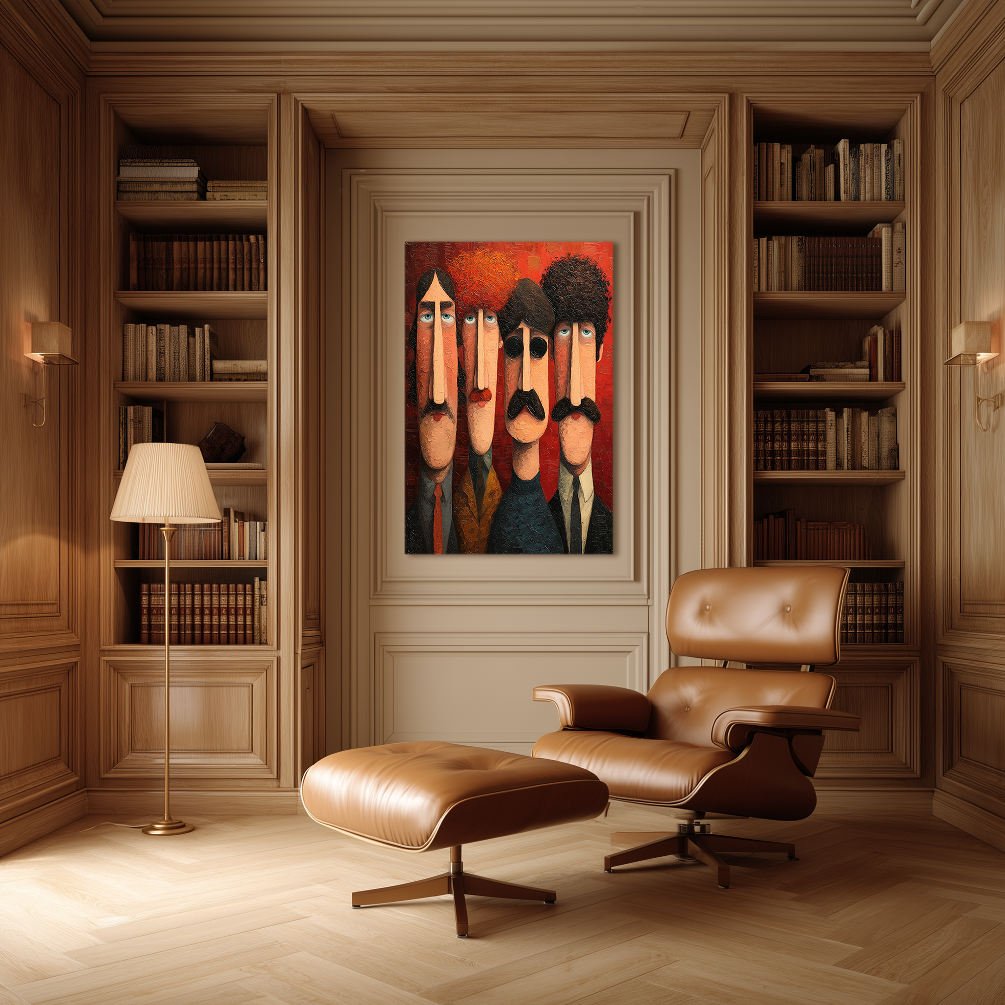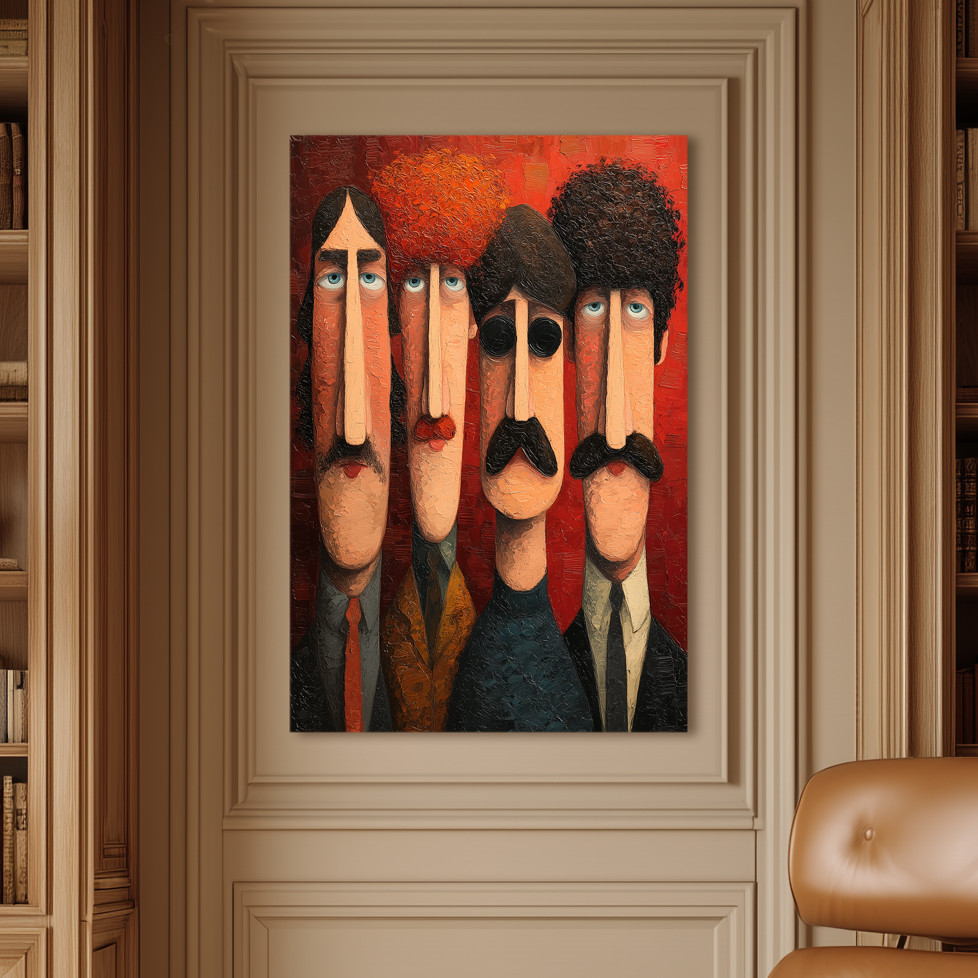 The Beatles as you've never seen them. This painterly interpretation—blending Modigliani echoes and pop caricature—transforms the legendary quartet into a lineup of elongated faces, blue eyes and thick brushwork over red. BLENZO studio distills the spirit of an iconic band into a bold and personal graphic language.