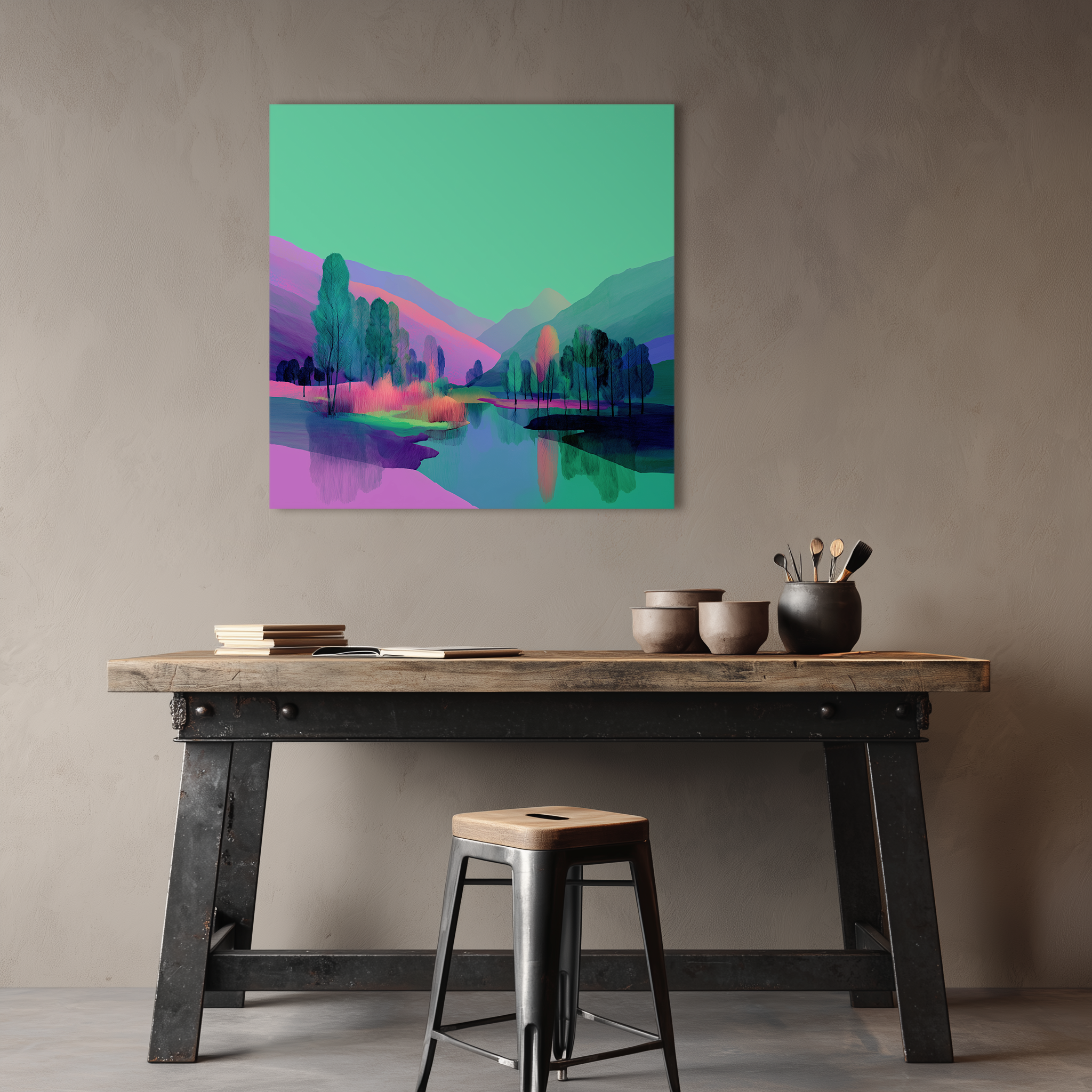 Un paisaje se despliega en tonalidades poco convencionales: verdes eléctricos, lilas profundos y rosas difusos construyen una escena surreal y vibrante. El reflejo de los árboles en el agua intensifica la sensación de otro mundo, donde la naturaleza se convierte en un lienzo psicodélico. Curada por BLENZO studio, esta obra transforma lo natural en experiencia sensorial.