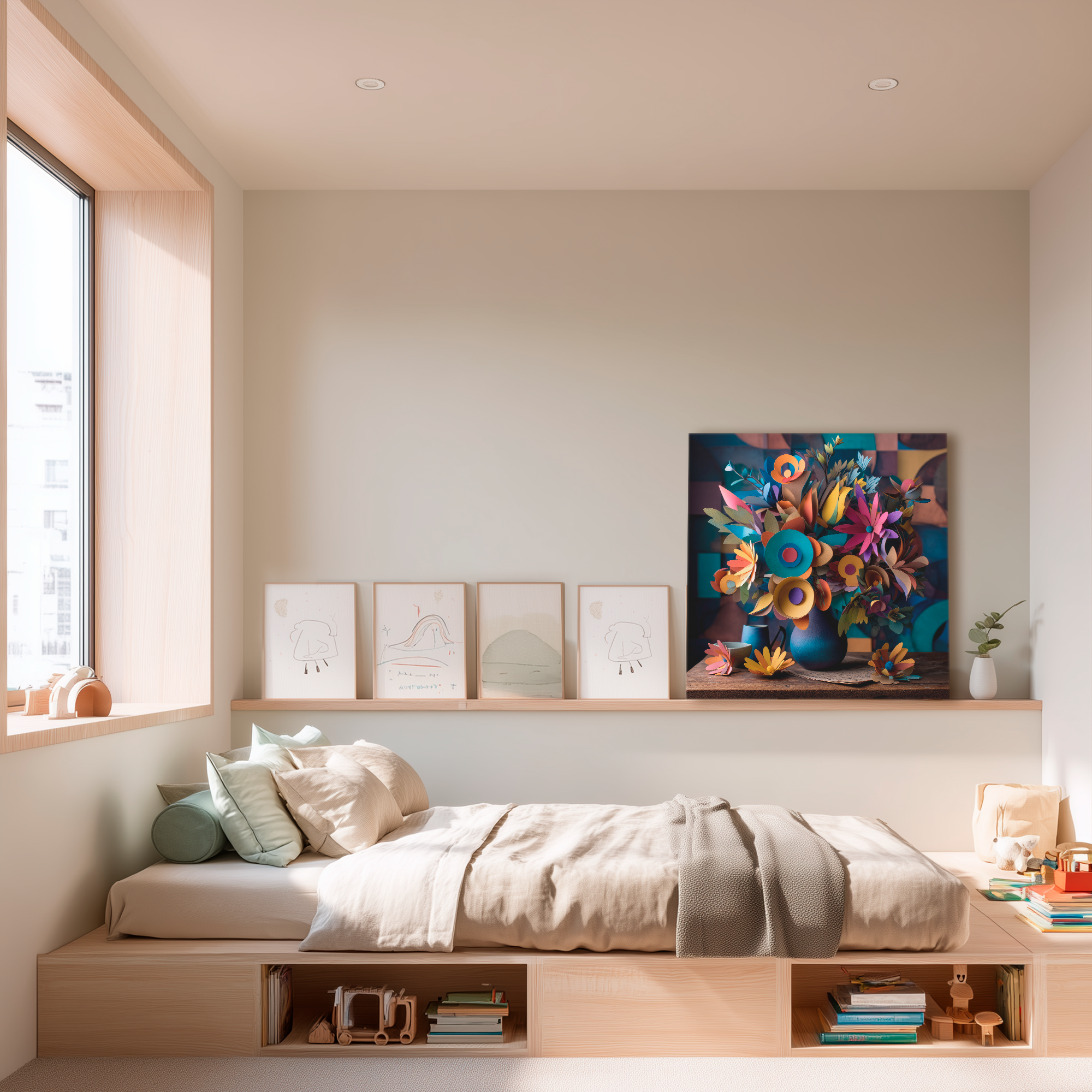 Un ramo imposible hecho de papel y geometría. Esta composición floral tridimensional fusiona artesanía y diseño con una paleta atrevida que recuerda al collage moderno. Cada pétalo parece recortado con precisión milimétrica, creando una sinfonía de formas y color. Una escena escultórica llena de optimismo, ensamblada por BLENZO studio.