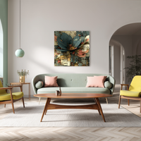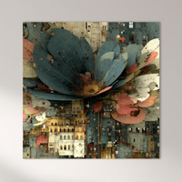 Una flor monumental emerge de un tejido urbano, como si los edificios fueran parte de su estructura orgánica. La combinación de arquitectura clásica con elementos florales digitales crea una tensión visual fascinante entre lo natural y lo artificial. Curada por BLENZO studio, esta obra representa una sinergia entre ciudad y naturaleza, con matices poéticos y futuristas.