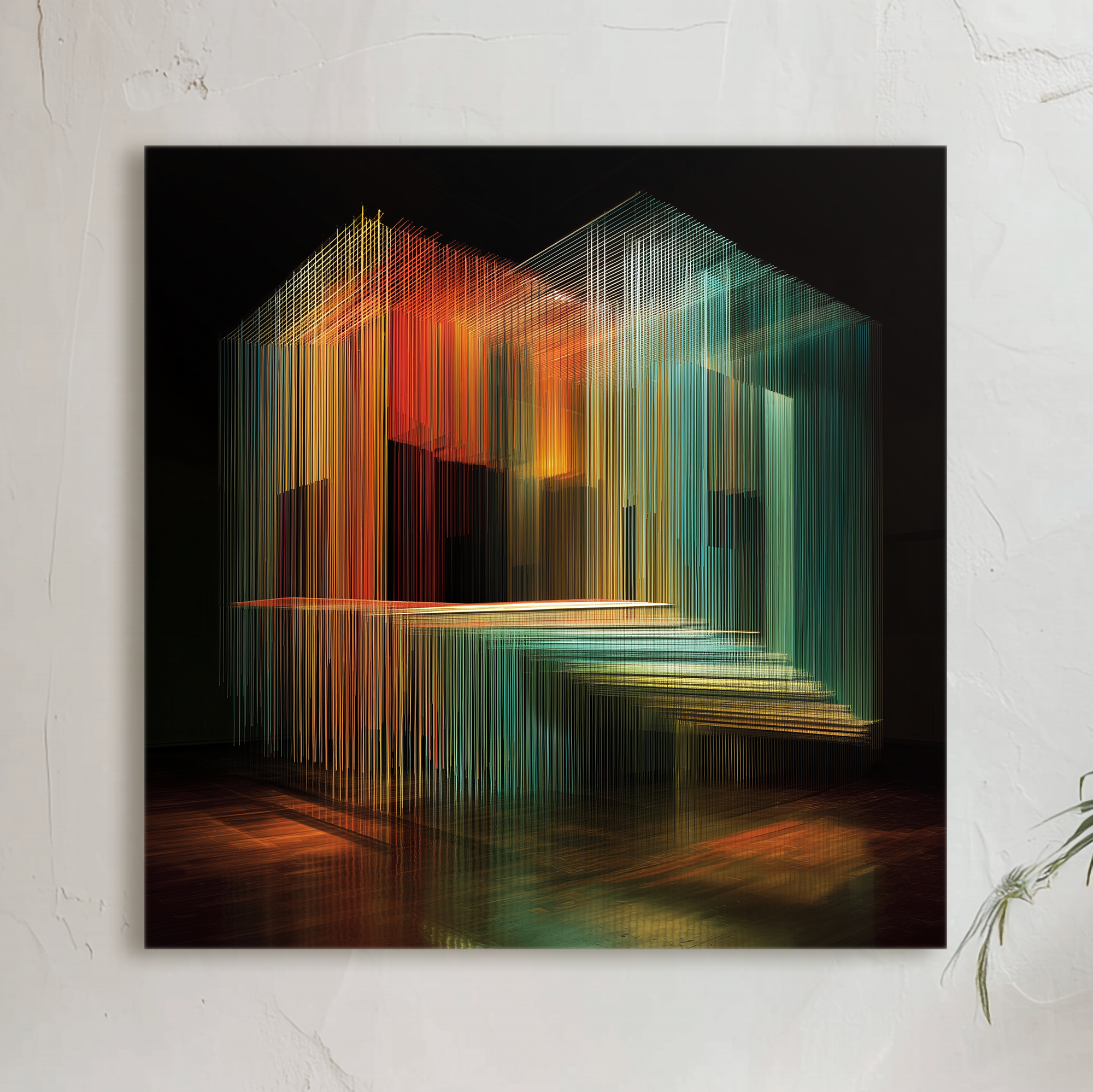 Una instalación abstracta de hilos de color suspendidos que generan volúmenes lumínicos en movimiento. Los tonos verdes, rojos y dorados se entrelazan en un juego espacial que recuerda a la arquitectura efímera y al arte cinético. Seleccionada por BLENZO studio, esta pieza evoca modernidad y profundidad sensorial.