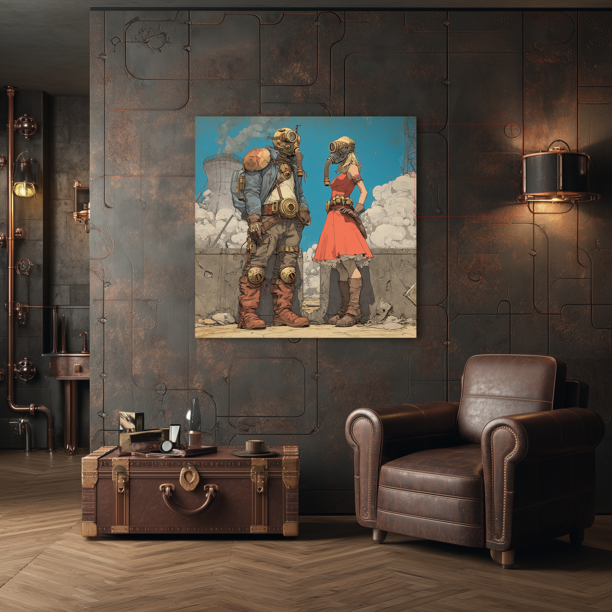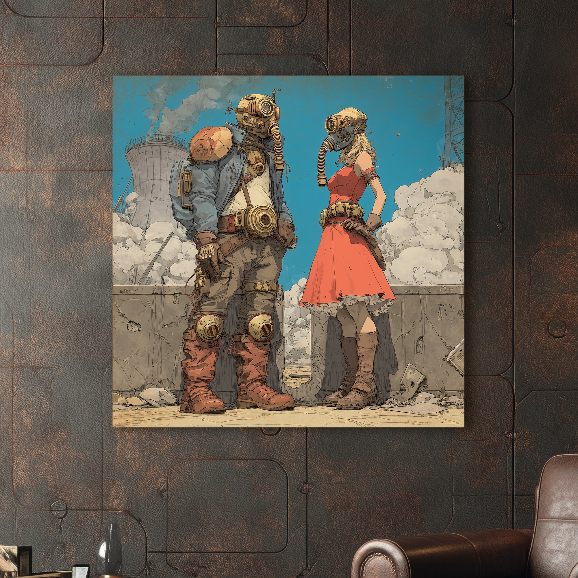 Amor atómico entre escombros. Esta escena de estilo atompunk muestra a una pareja con máscaras antigás en un paisaje industrial devastado, donde lo romántico y lo apocalíptico conviven con ironía. Ella con vestido rojo, él con equipo de combate. Una estética retrofuturista reinterpretada con humor gráfico por BLENZO studio.