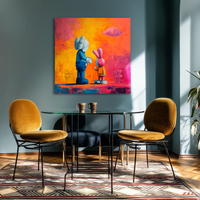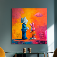 Dos figuras contemporáneas se encuentran en una escena que combina inocencia con un trasfondo emocional más complejo. El fondo vibrante y las texturas marcadas elevan esta fascinante creación de BLENZO studio.