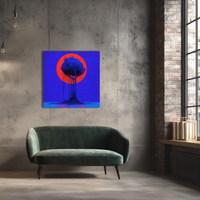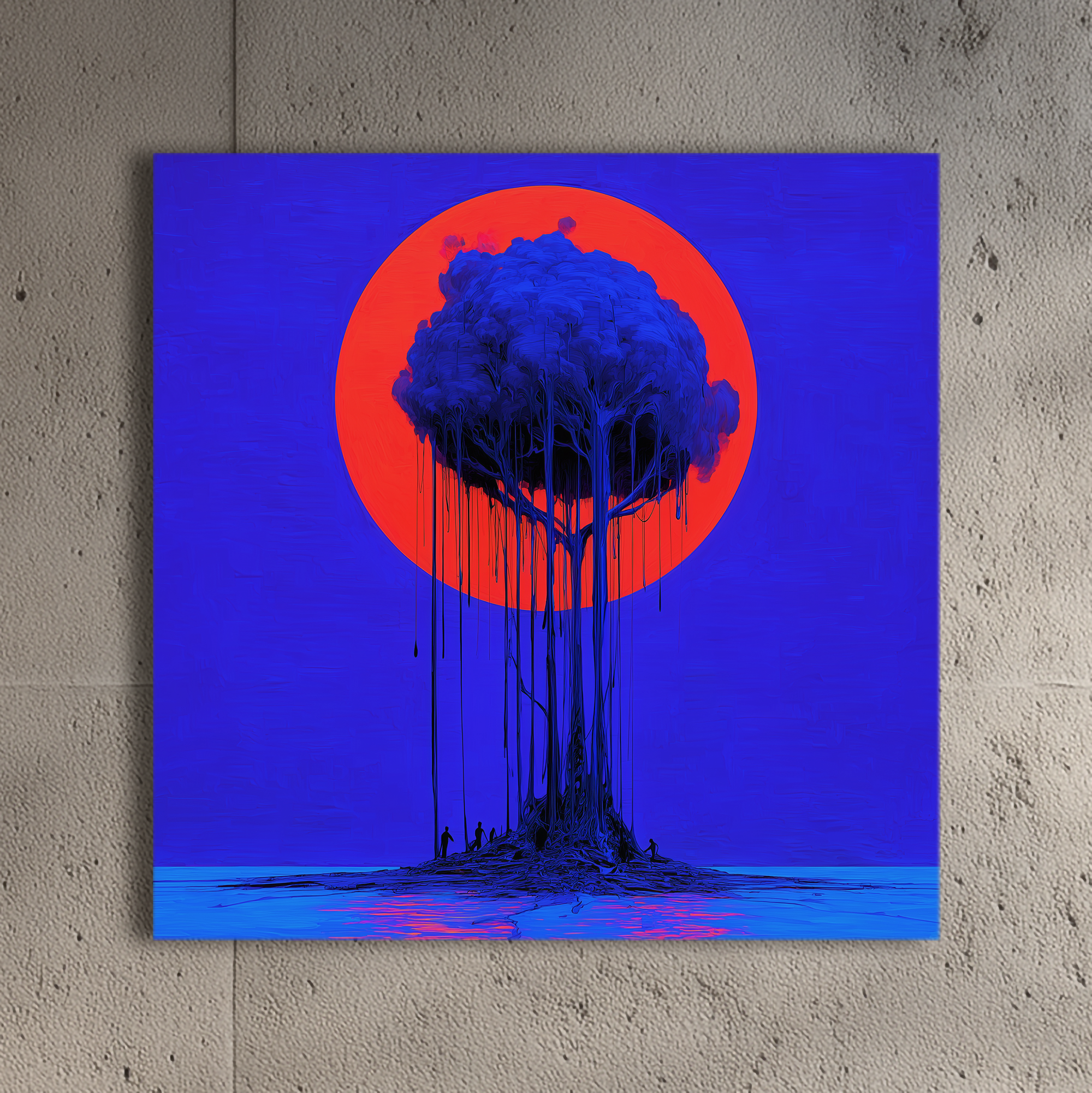 Un árbol monumental se alza en el centro de una atmósfera surreal, bañada en azules eléctricos y contrastes incandescentes. Los trazos se estiran como ríos que fluyen desde las alturas hacia un suelo tranquilo, cargado de misterio. Curada por BLENZO studio, esta obra combina fuerza visual y simbolismo en una composición de alto impacto emocional.