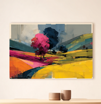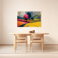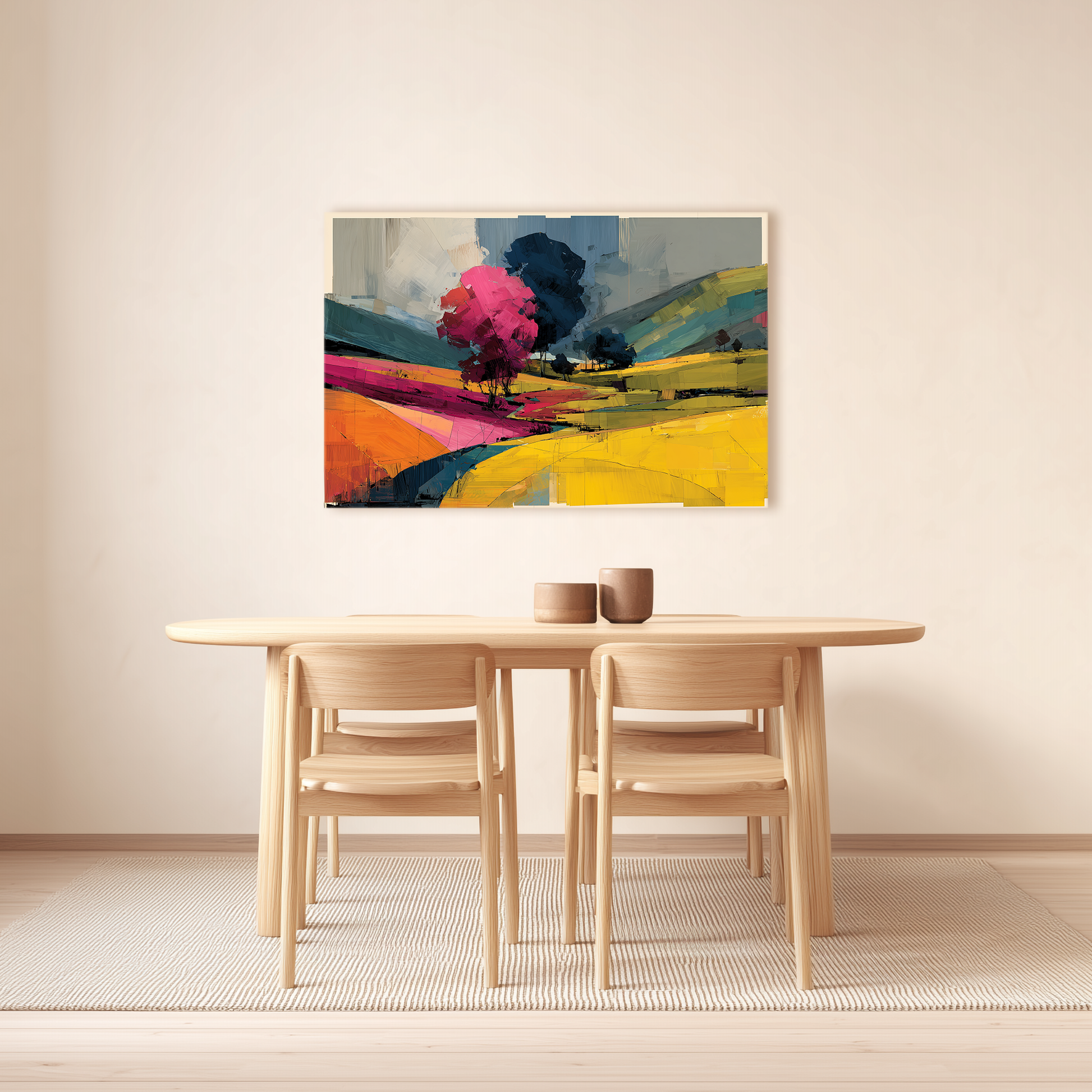 Un paisaje vibrante de colinas onduladas y árboles en tonos intensos, donde el fucsia, el amarillo y el azul profundo se entrelazan en una composición expresionista cargada de energía. La obra transmite dinamismo y profundidad, fusionando lo abstracto y lo figurativo con un estilo único. Una creación cuidadosamente seleccionada por BLENZO studio.
