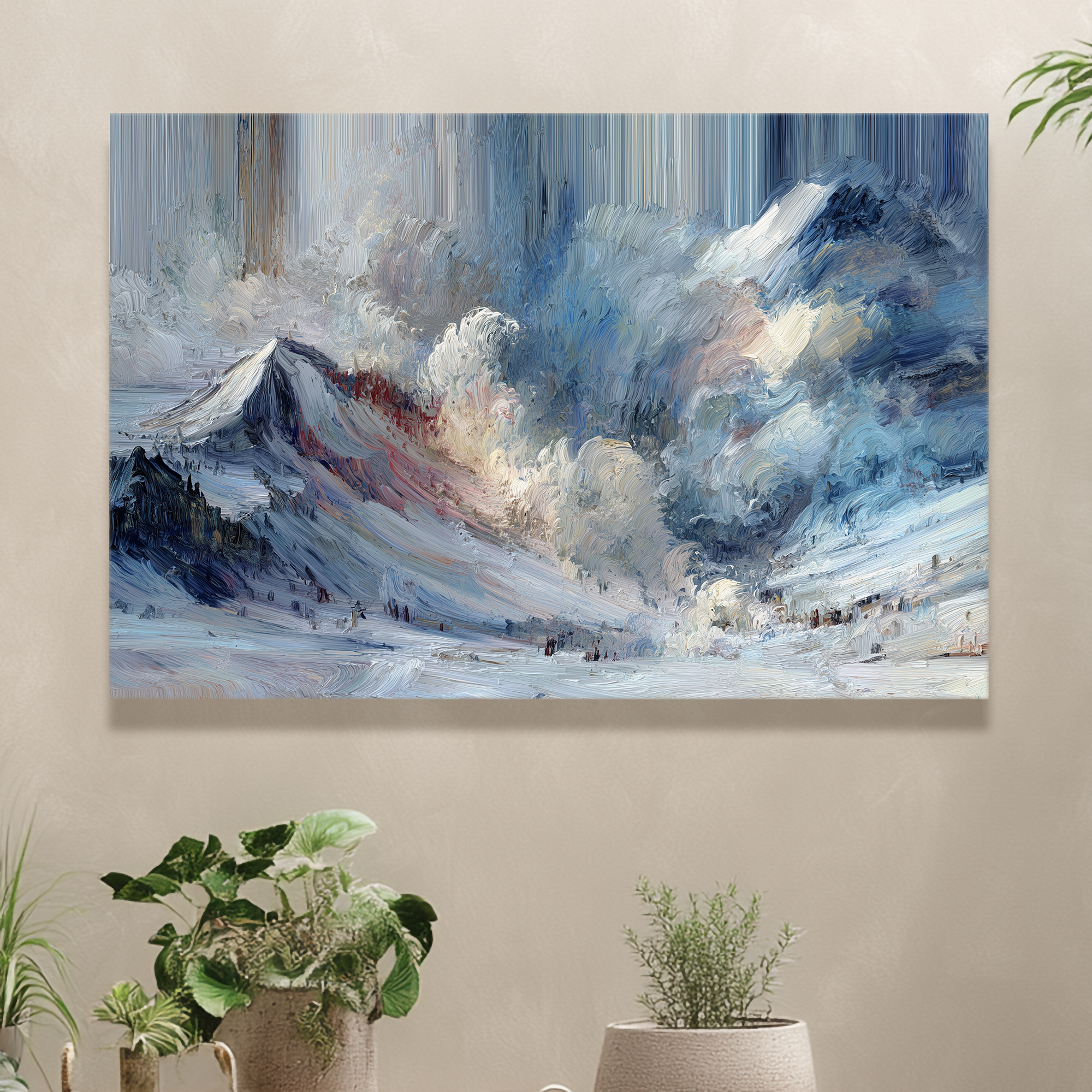 Una escena invernal onírica y dinámica, donde los trazos se convierten en torbellinos de pintura que envuelven la montaña y el cielo. BLENZO studio selecciona esta obra por su capacidad de transformar el paisaje en pura energía visual.