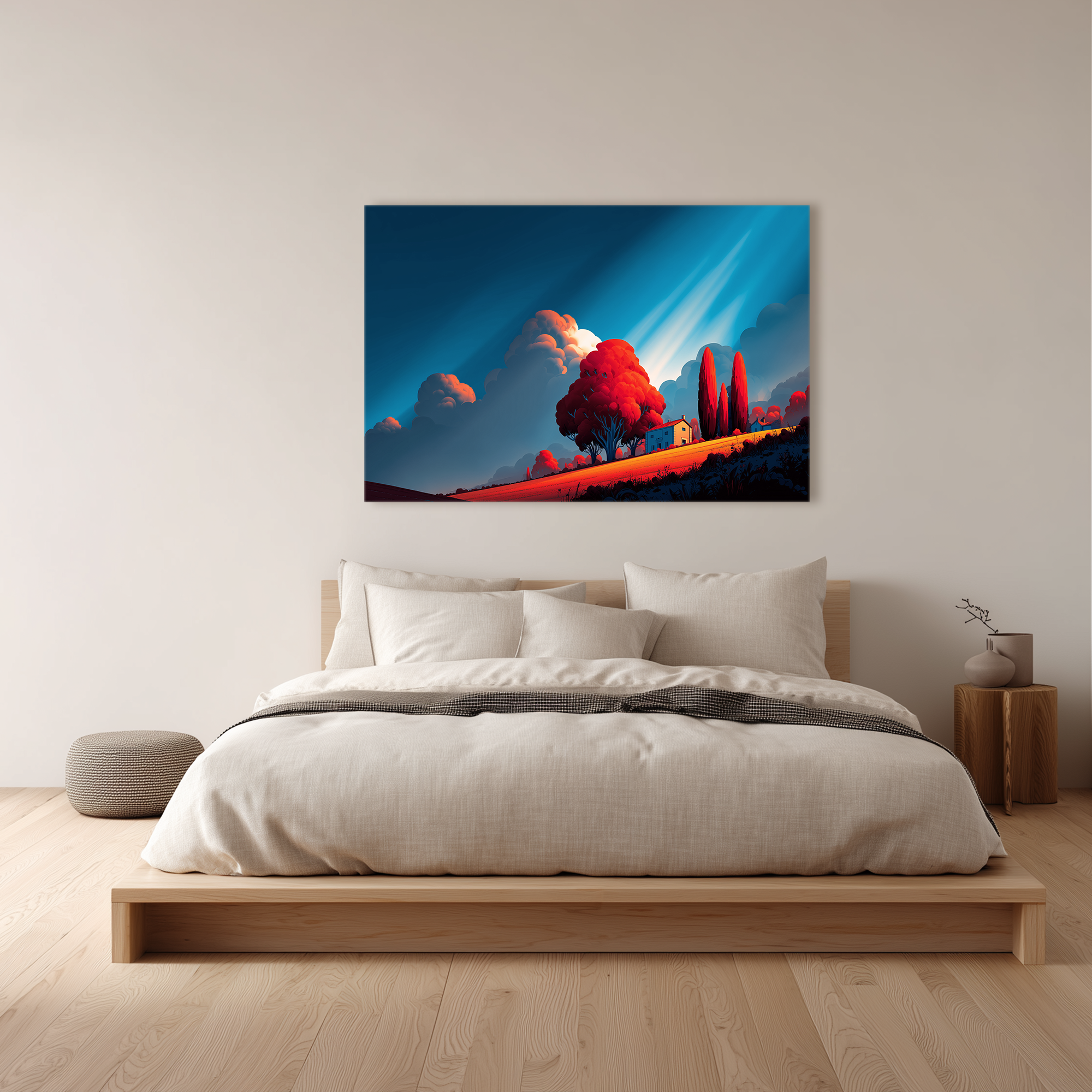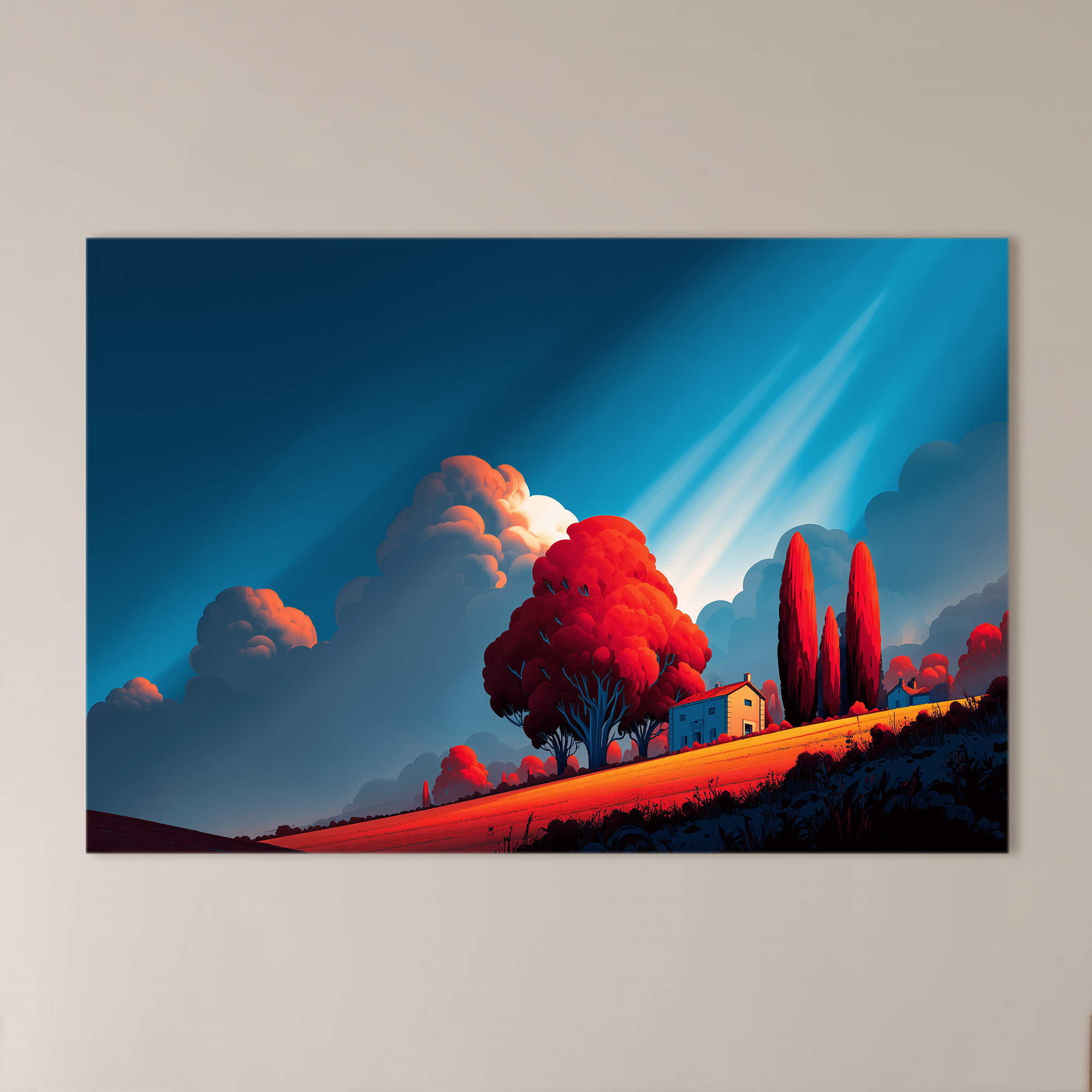 Un paisaje onírico donde la calma y la intensidad coexisten. Bajo un cielo dramáticamente azul, árboles rojizos de formas suaves y una casa rural parecen emerger de una escena pictórica detenida en el tiempo. Curada por BLENZO studio, esta obra transporta a un universo de serenidad vibrante y contemplación visual.