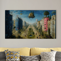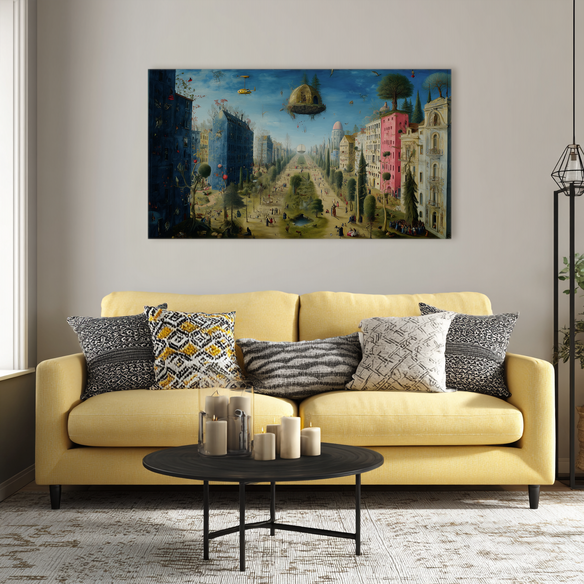 Una ciudad fantástica al estilo de El Bosco. Esta escena panorámica despliega un desfile