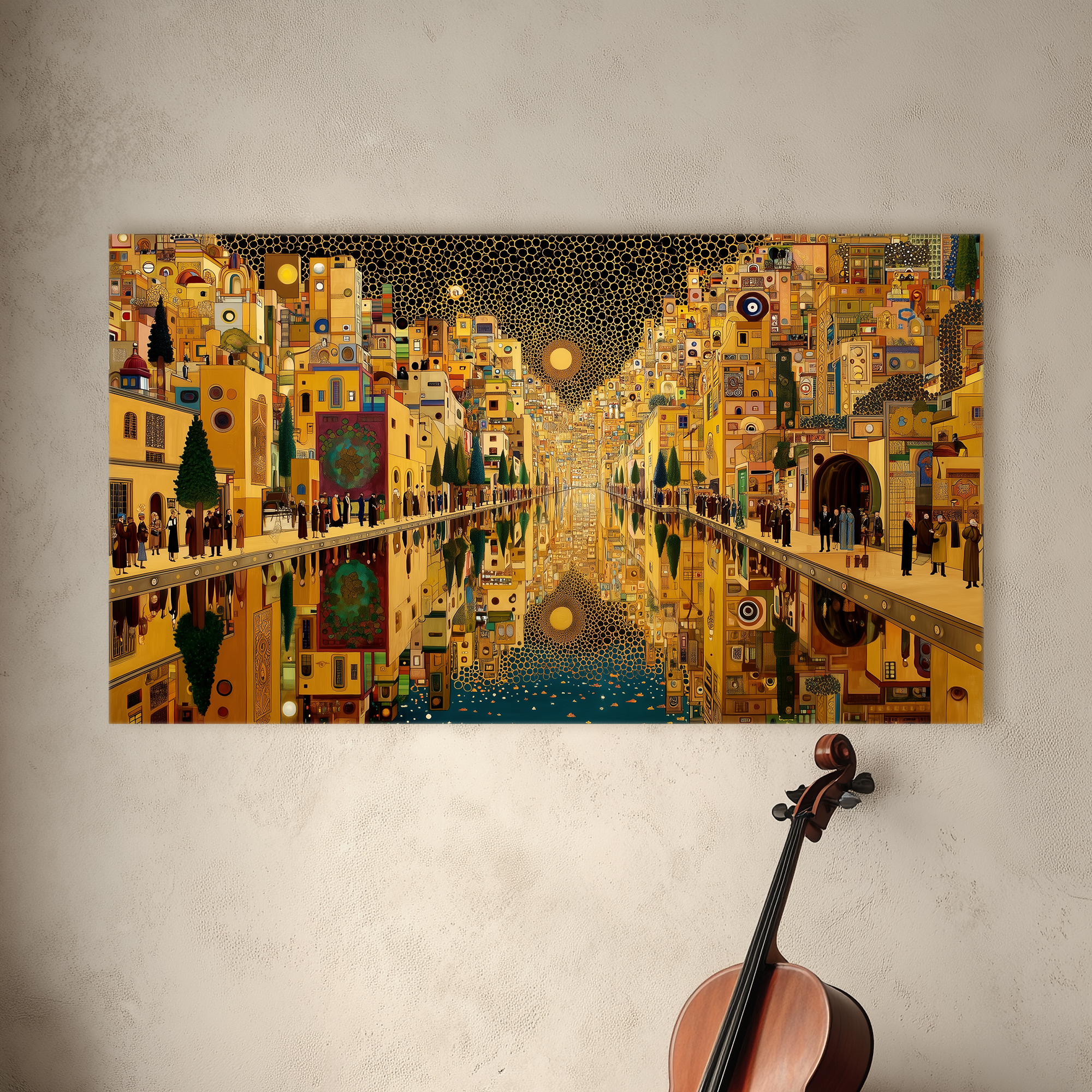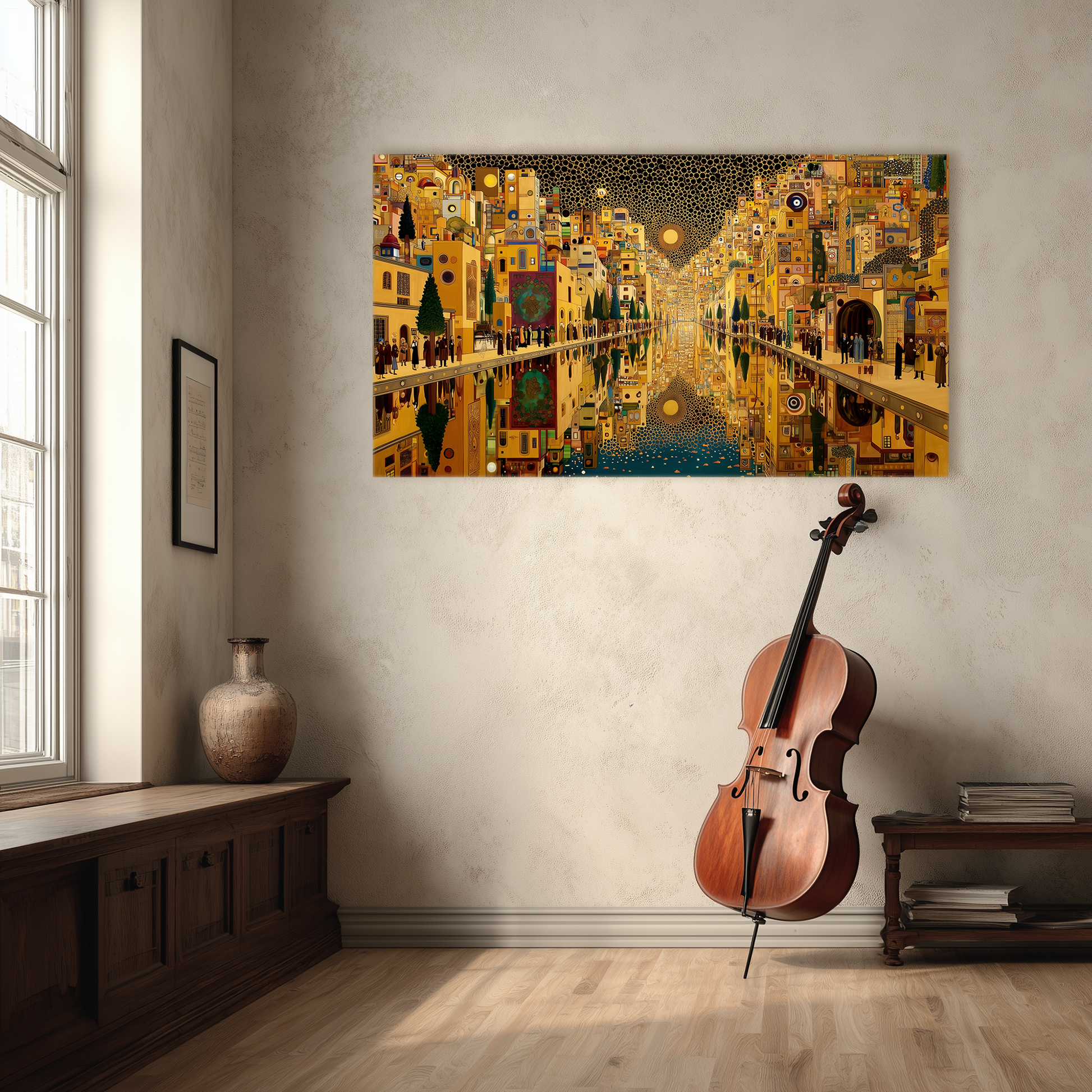 Gustav Klimt. Esta escena onírica simula un río infinito flanqueado por arquitectura simbólica, patrones circulares y figuras humanas en procesión. Una fantasía visual de BLENZO studio que brilla como un vitral moderno.