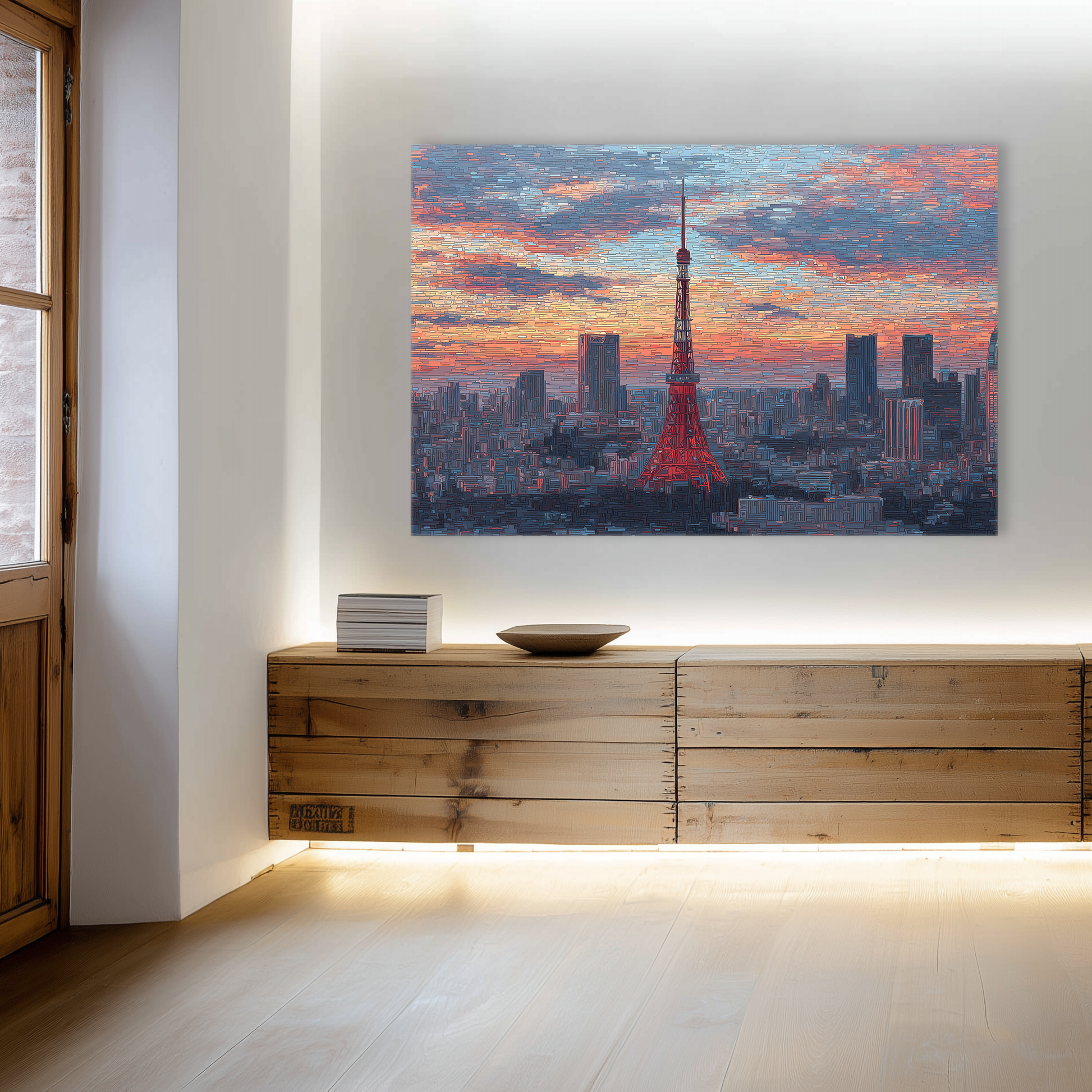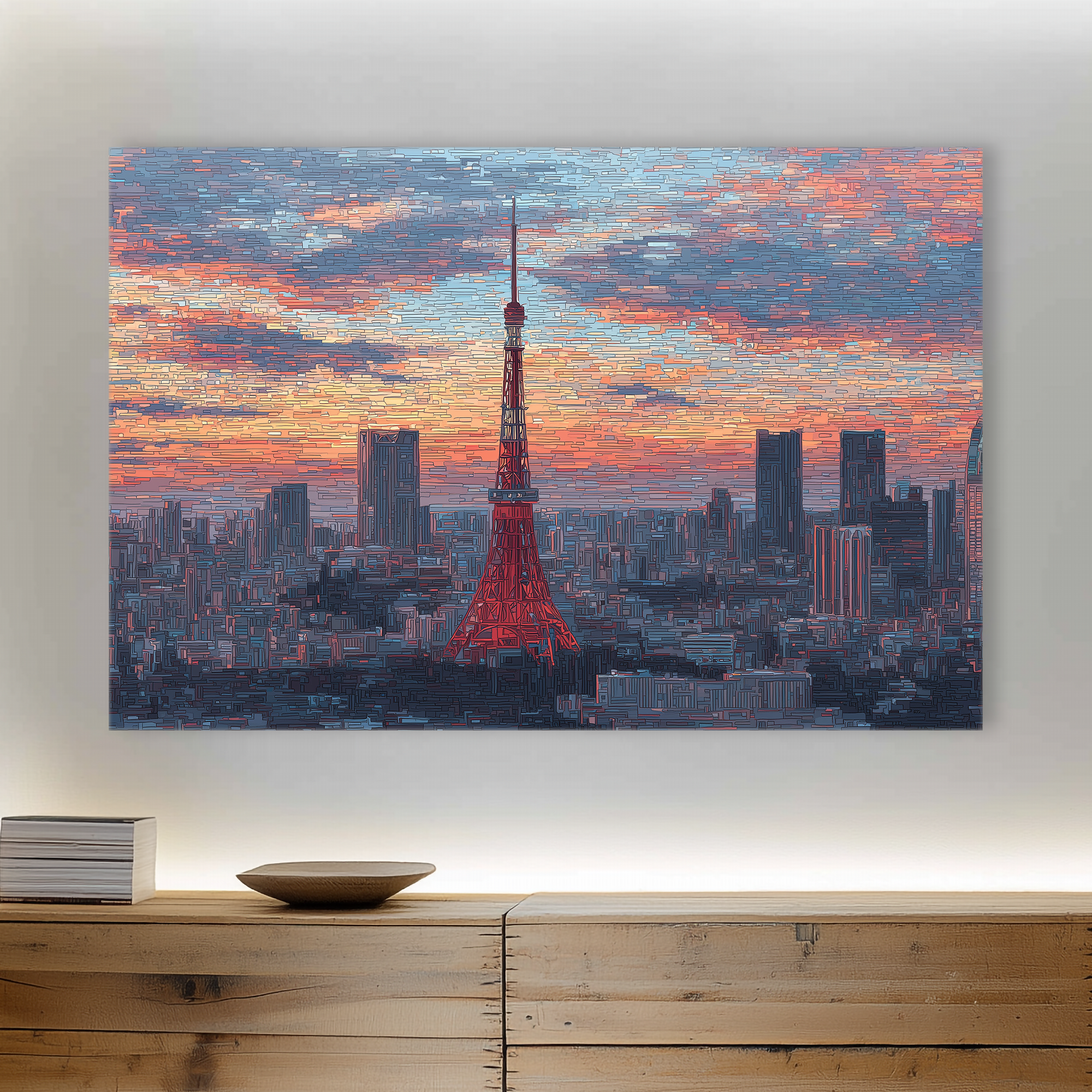 Con una textura casi de mosaico digital, esta vista del skyline de Tokio al atardecer adquiere una dimensión pictórica abstracta. BLENZO studio plasma la torre como vértice simbólico entre ciudad y cielo, componiendo una sinfonía de trazos, bloques y colores desaturados.