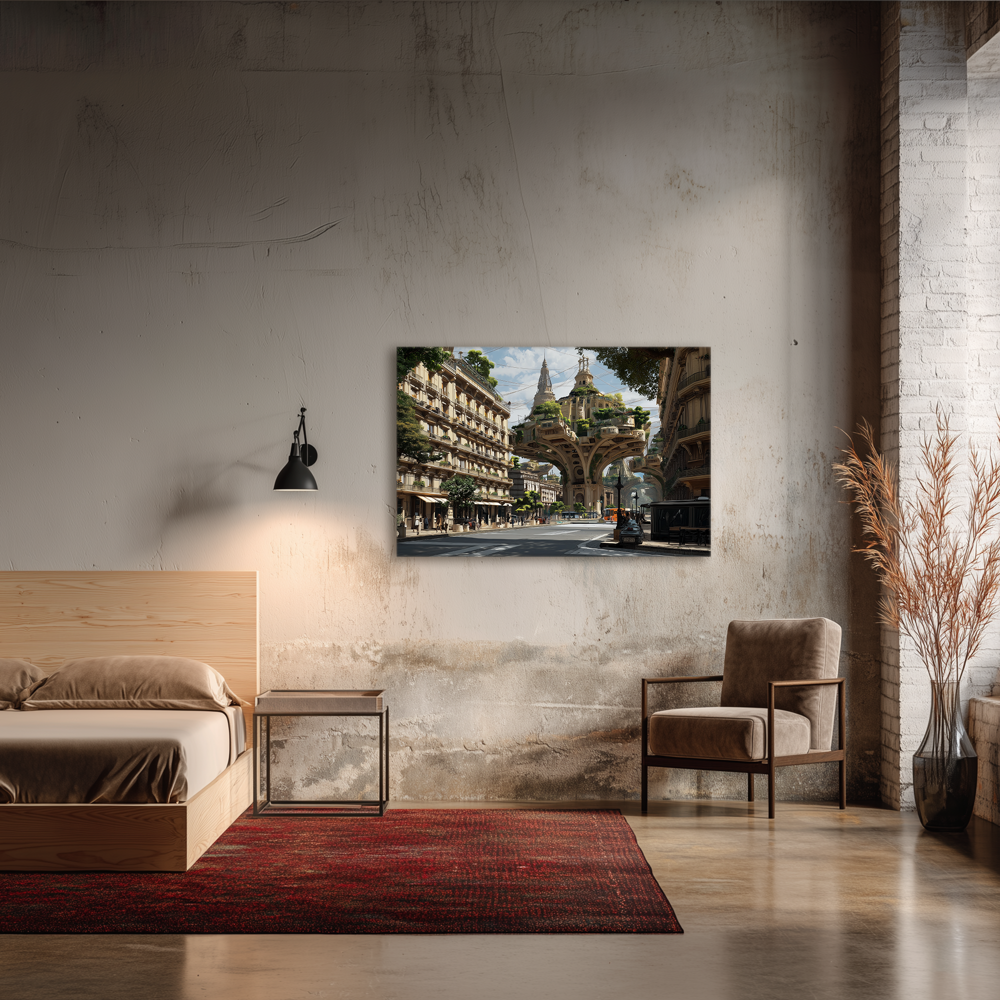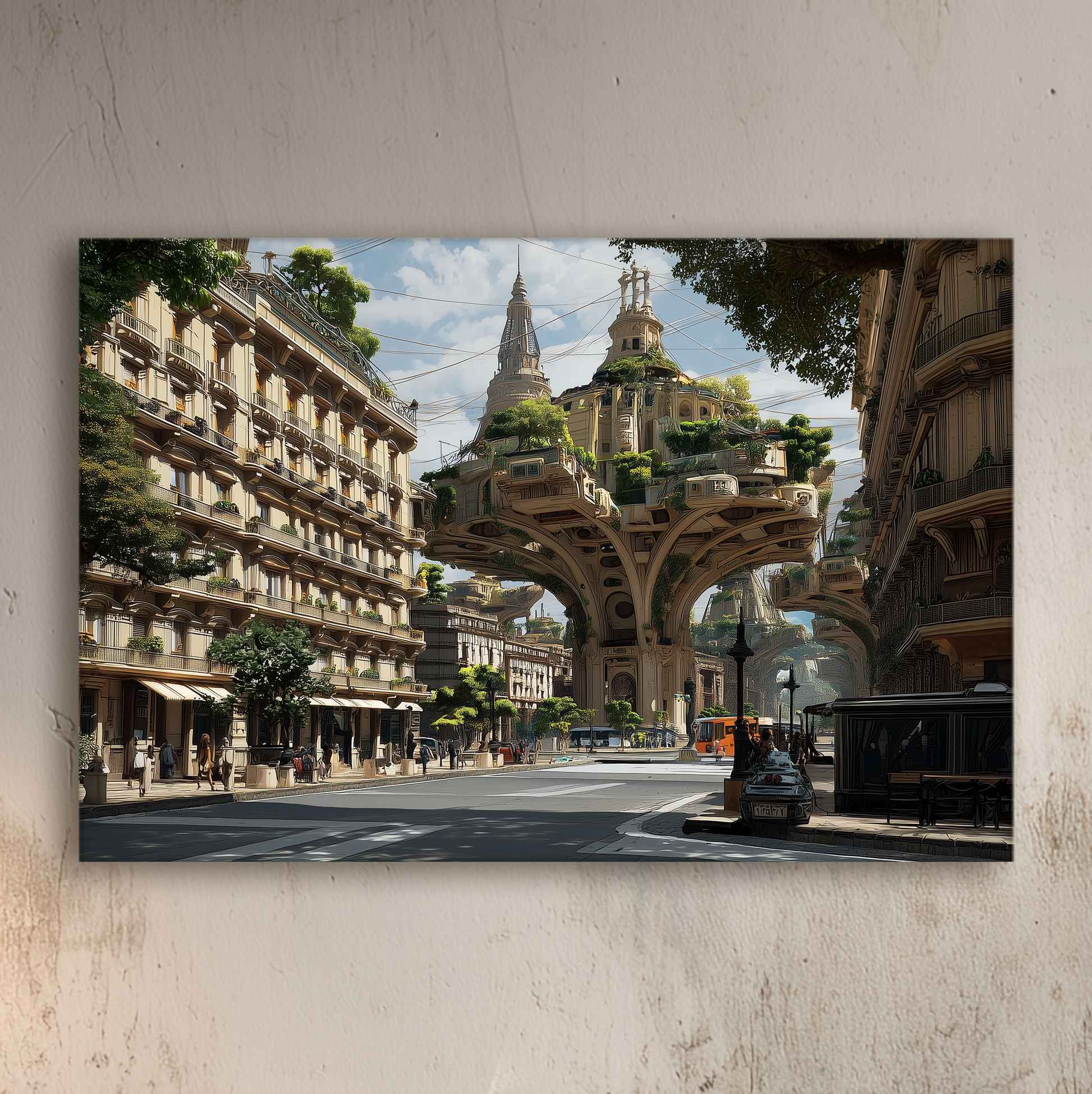 Una metrópolis elevada y utópica se abre paso entre arquitectura clásica y vegetación exuberante. La escena combina equilibrio y modernidad, en un render 3D de precisión casi fotográfica. Una visión verde del futuro urbano, cuidadosamente elegida por BLENZO studio.