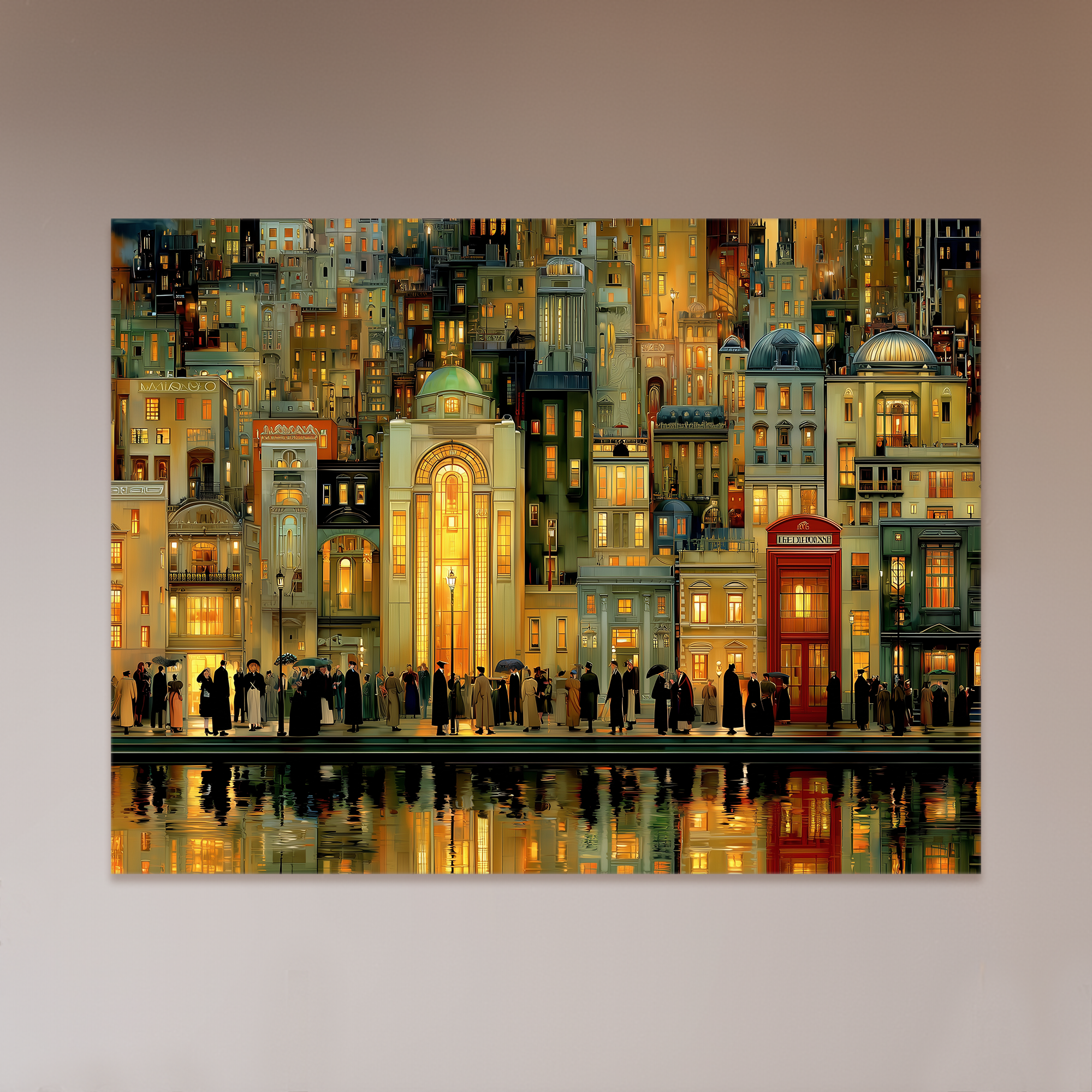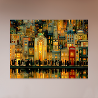 Un paisaje urbano detallado, donde las fachadas iluminadas por el cálido resplandor nocturno evocan una ciudad idealizada. La multiplicidad de estilos arquitectónicos y la presencia humana crean una escena vibrante y nostálgica. Esta obra, curada por BLENZO studio, propone una mirada romántica sobre la vida urbana desde una perspectiva casi teatral.