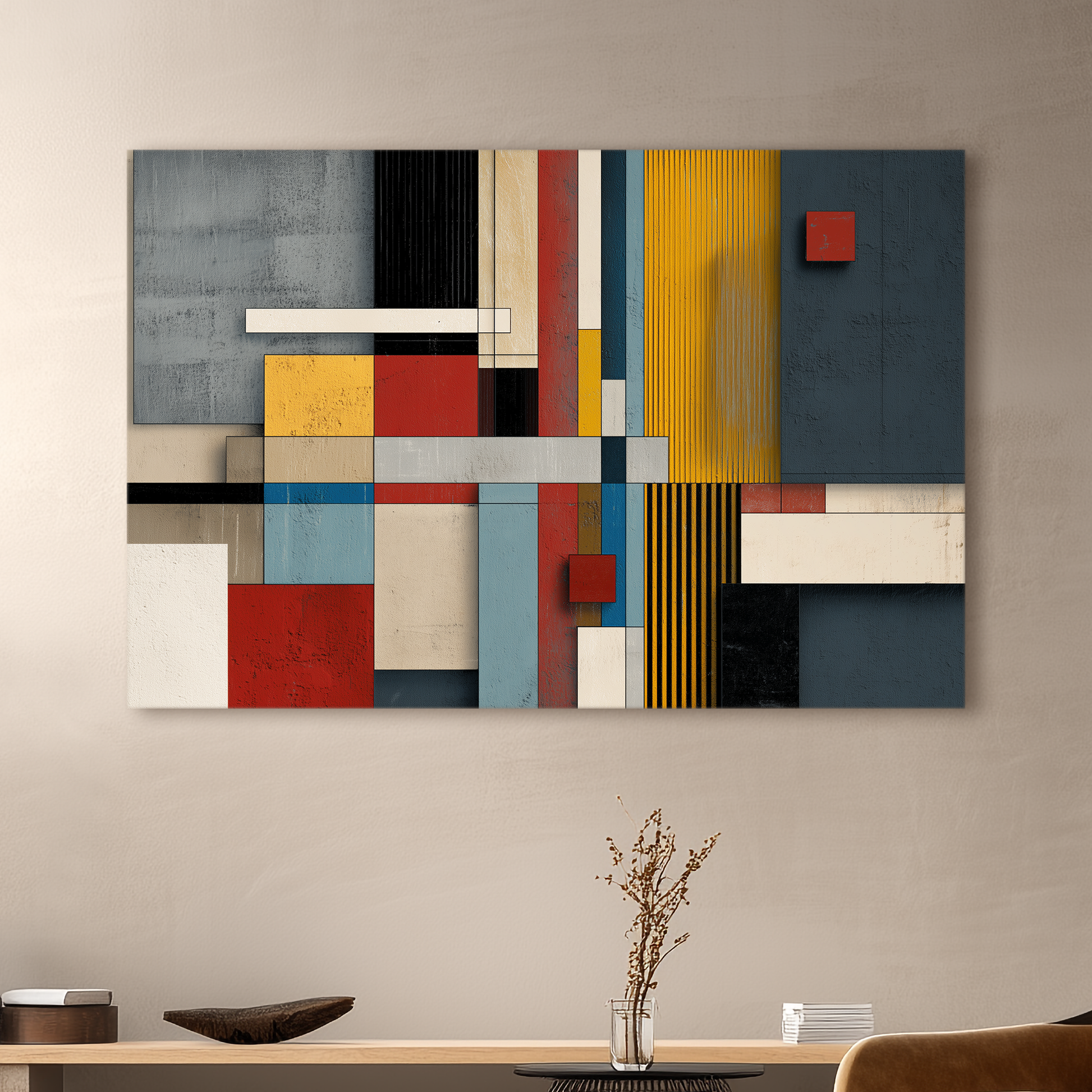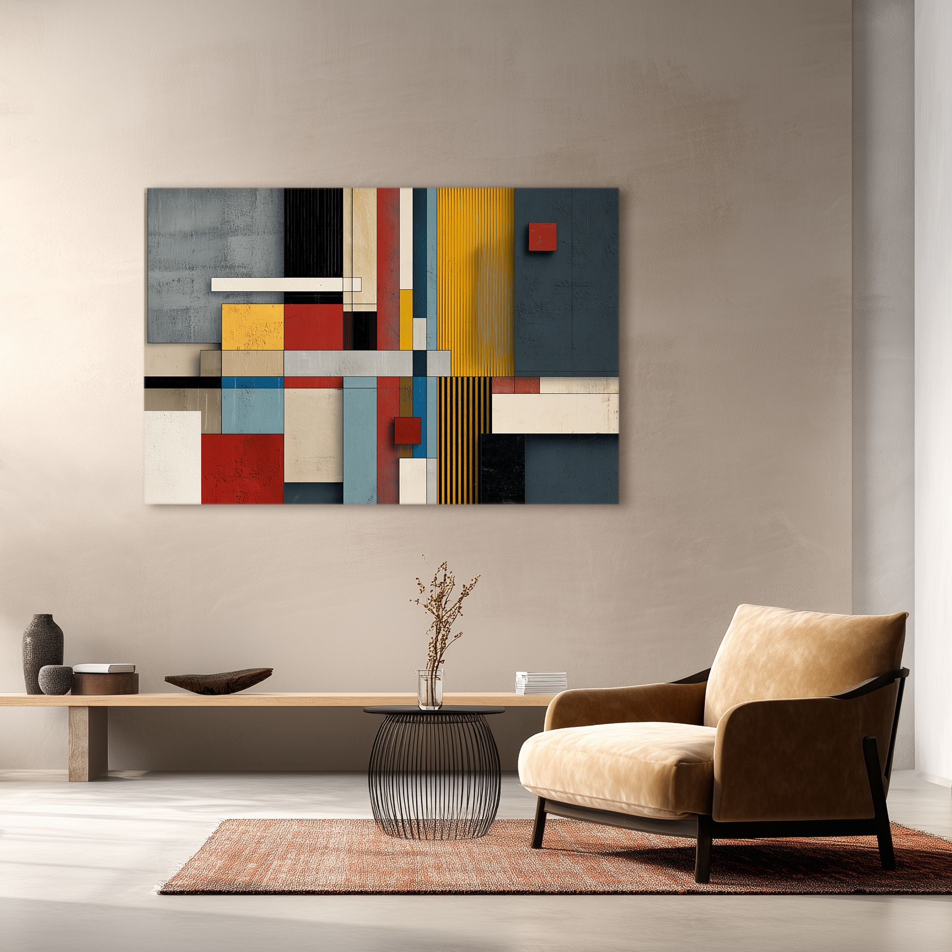 Una composición geométrica de inspiración Bauhaus que combina volúmenes planos, colores primarios y textura mural. Esta obra de BLENZO studio explora la abstracción arquitectónica con equilibrio visual y rigor compositivo.
