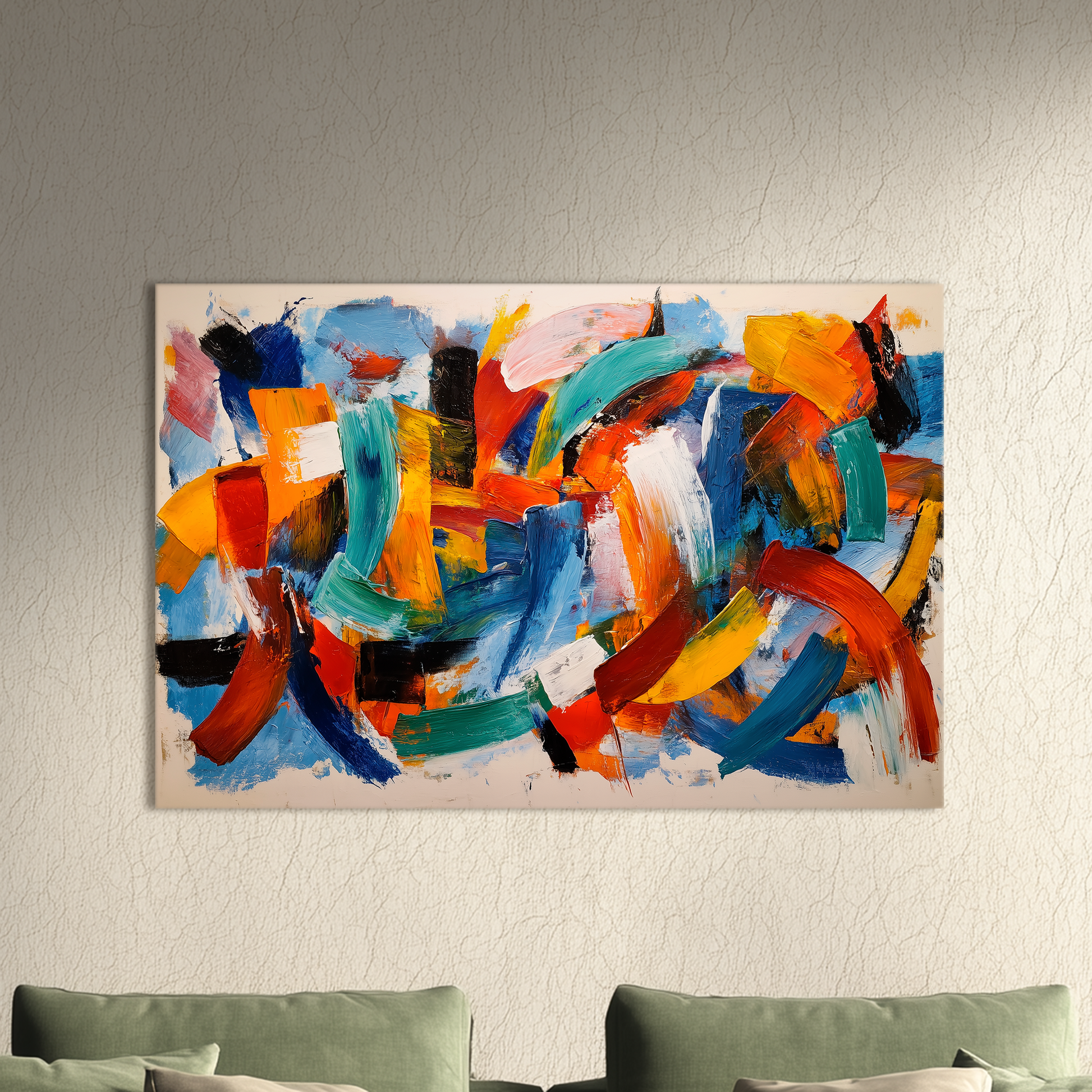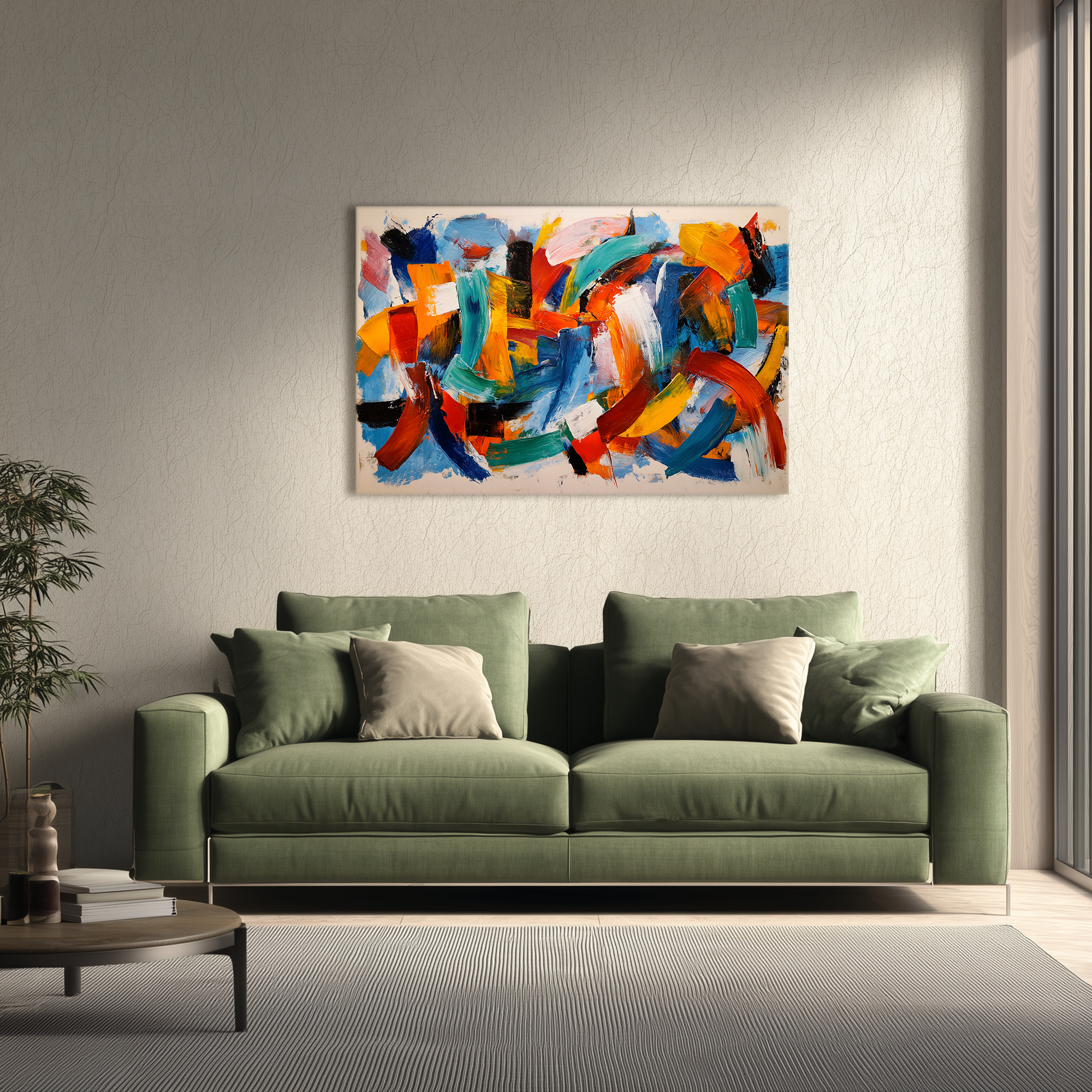 Una explosión de color y energía se plasma en esta obra abstracta con grandes pinceladas cargadas de textura. Los tonos cálidos y fríos se entrelazan en un movimiento rítmico que transmite dinamismo y libertad creativa. Curada por BLENZO studio, esta pieza aporta vitalidad y carácter a cualquier ambiente.
