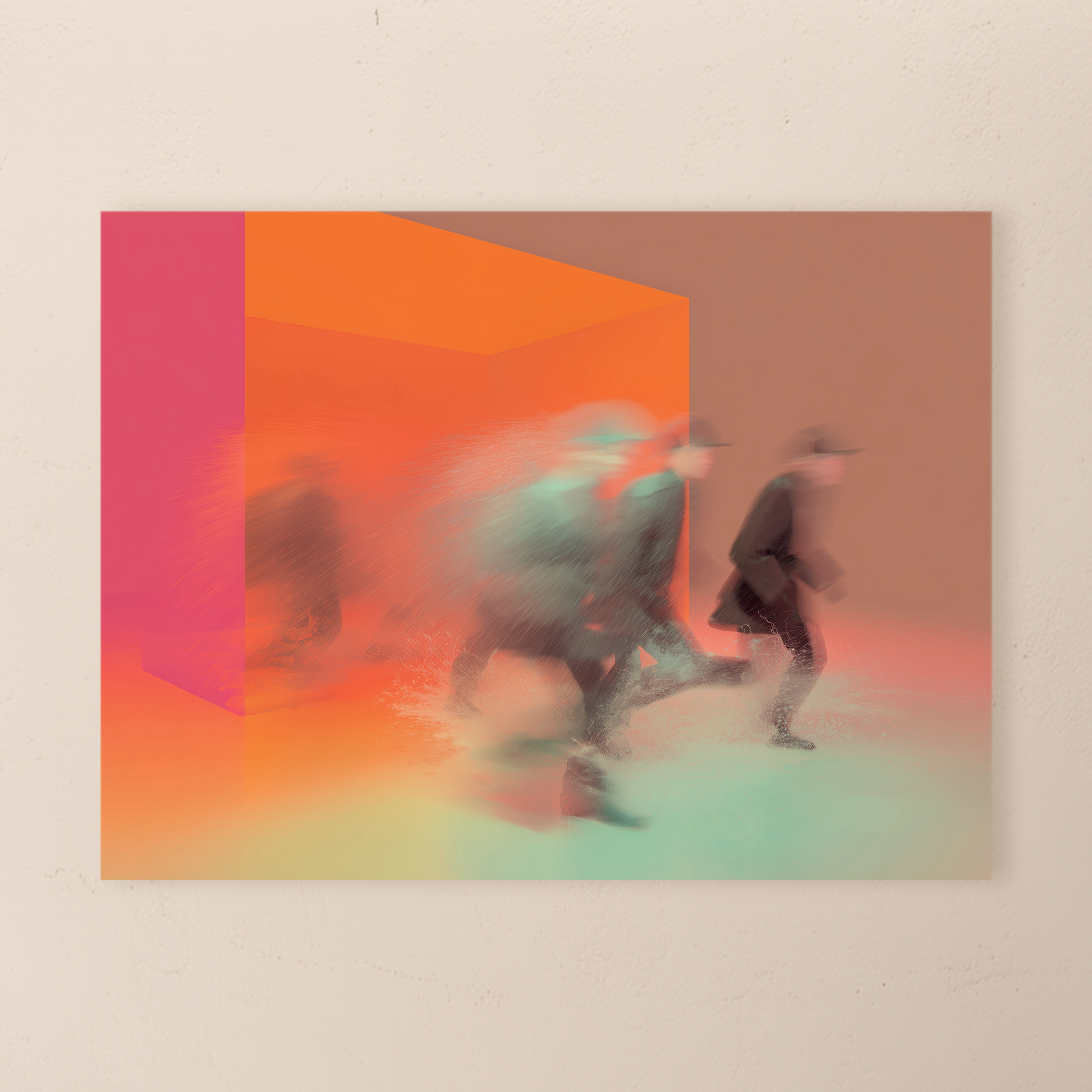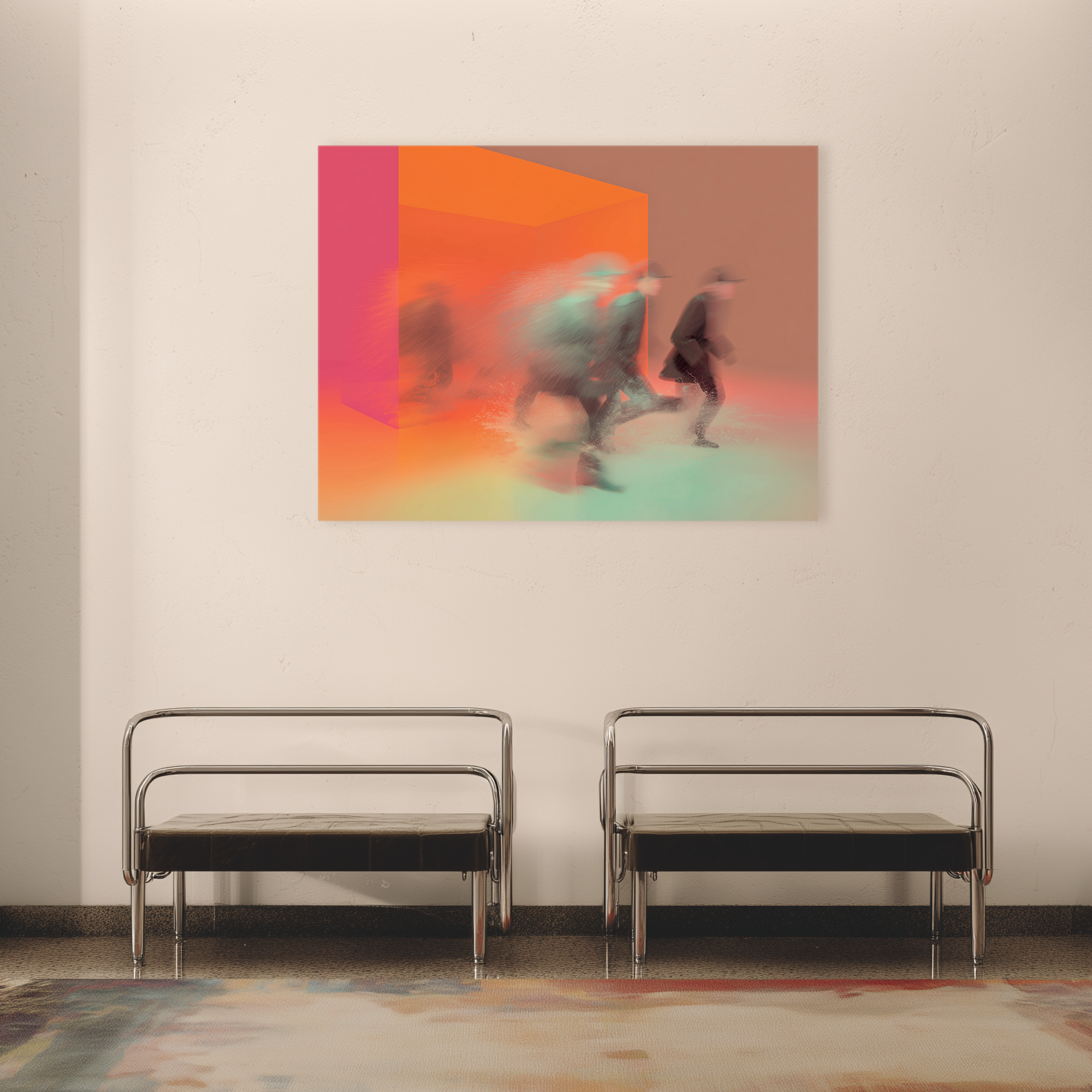 Un escenario vibrante donde figuras difusas atraviesan un espacio cromático en transición. La obra combina movimiento, velocidad y atmósfera digital, jugando con la percepción del tiempo y la identidad. Seleccionada por BLENZO studio, transmite energía, fugacidad y una estética contemporánea de impacto.