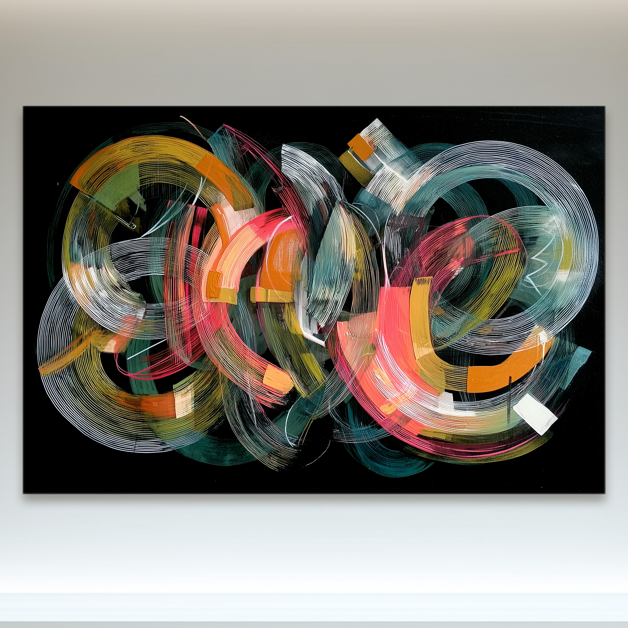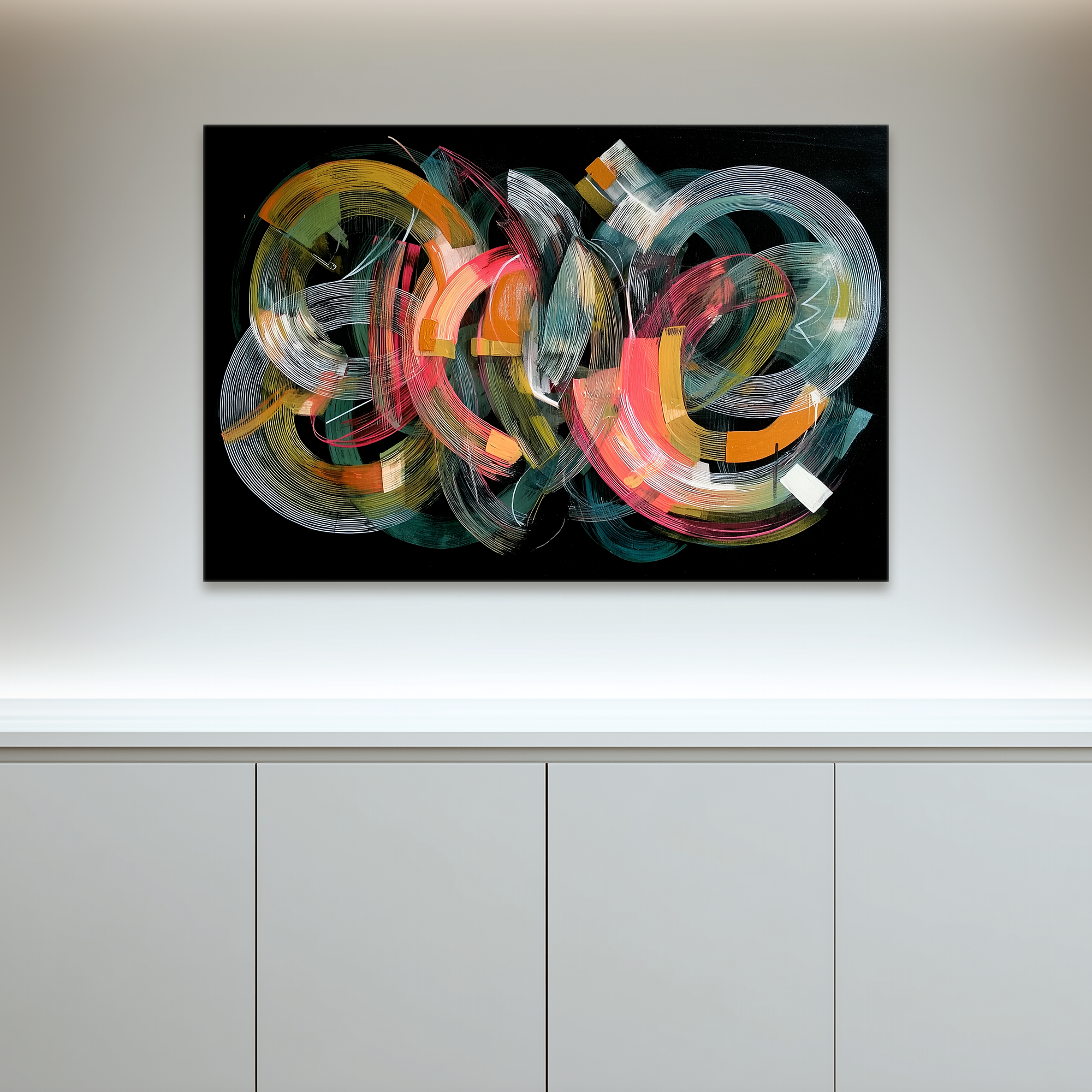 Trazos circulares y gestuales se superponen en una danza cromática sobre fondo negro, creando una energía visual vibrante y en constante movimiento. Esta pieza, seleccionada por BLENZO studio, explora la expresividad del trazo libre, con una paleta que oscila entre lo cálido y lo eléctrico. El conjunto recuerda una coreografía abstracta que transforma cualquier espacio con vitalidad.