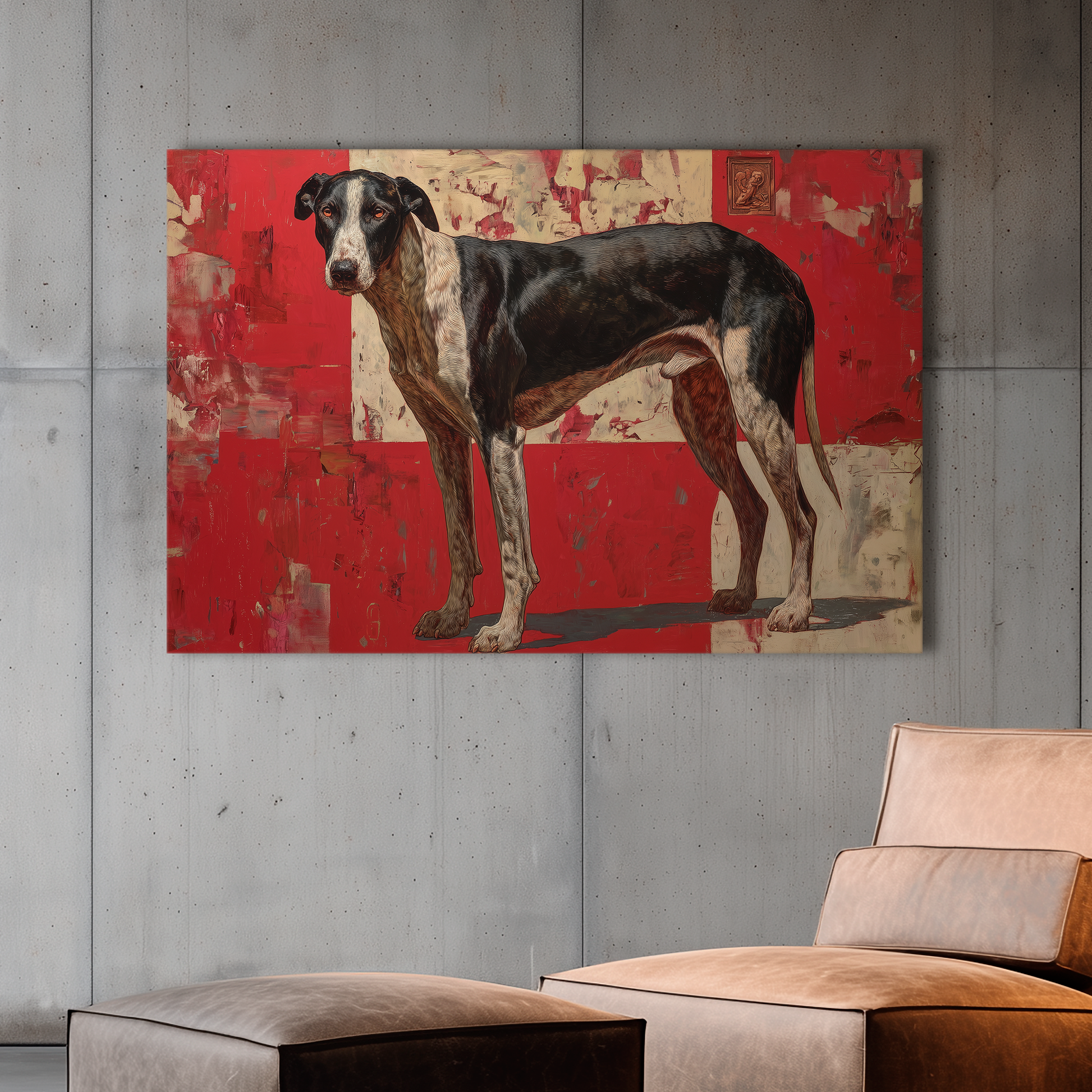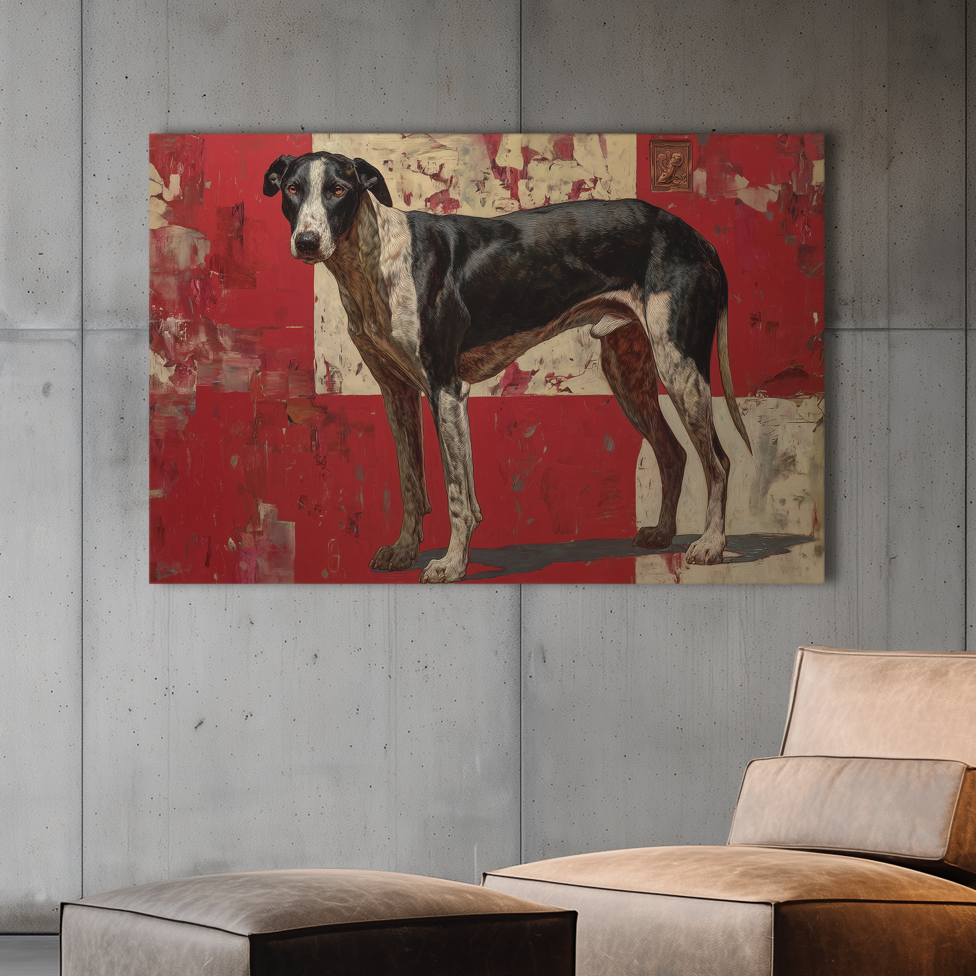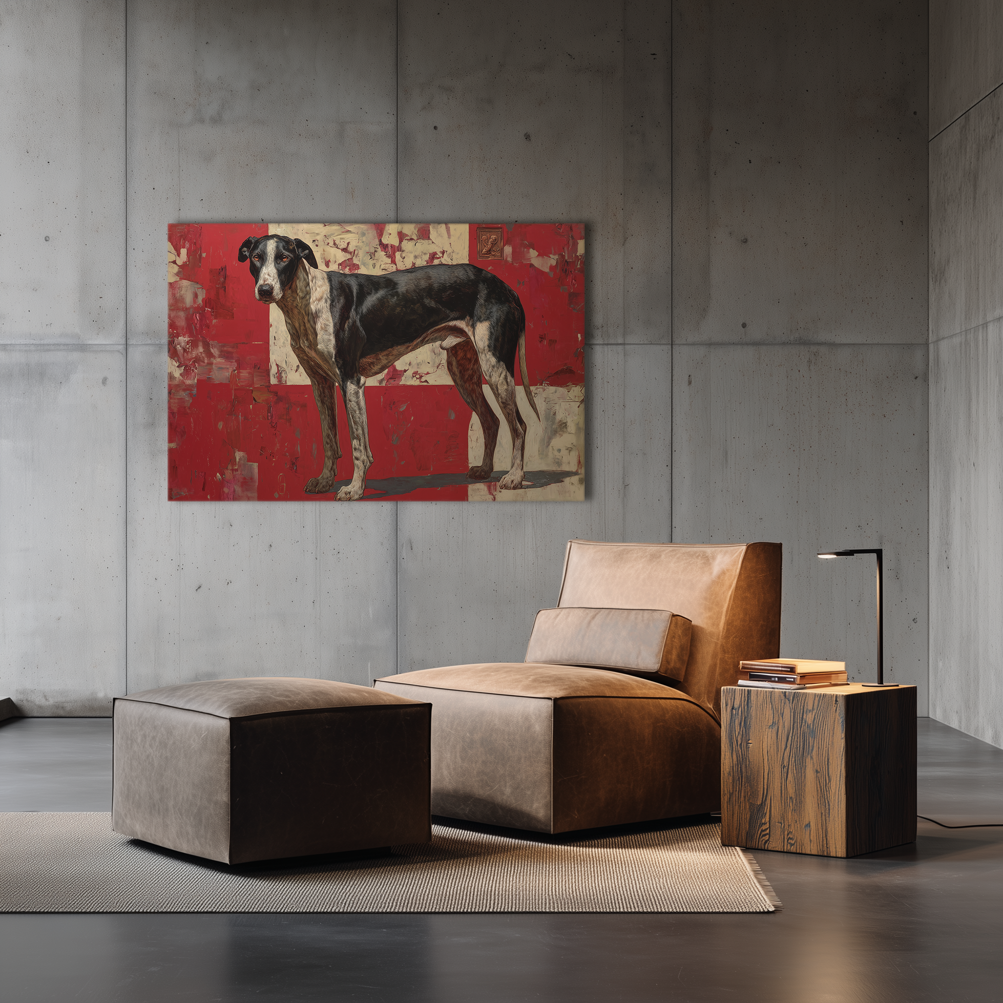 Un elegante galgo posando con solemnidad sobre un fondo rojo de textura pictórica. Esta obra ha sido cuidadosamente seleccionada por BLENZO studio por la intensidad de su mirada, el tratamiento matérico del fondo y la nobleza que transmite.