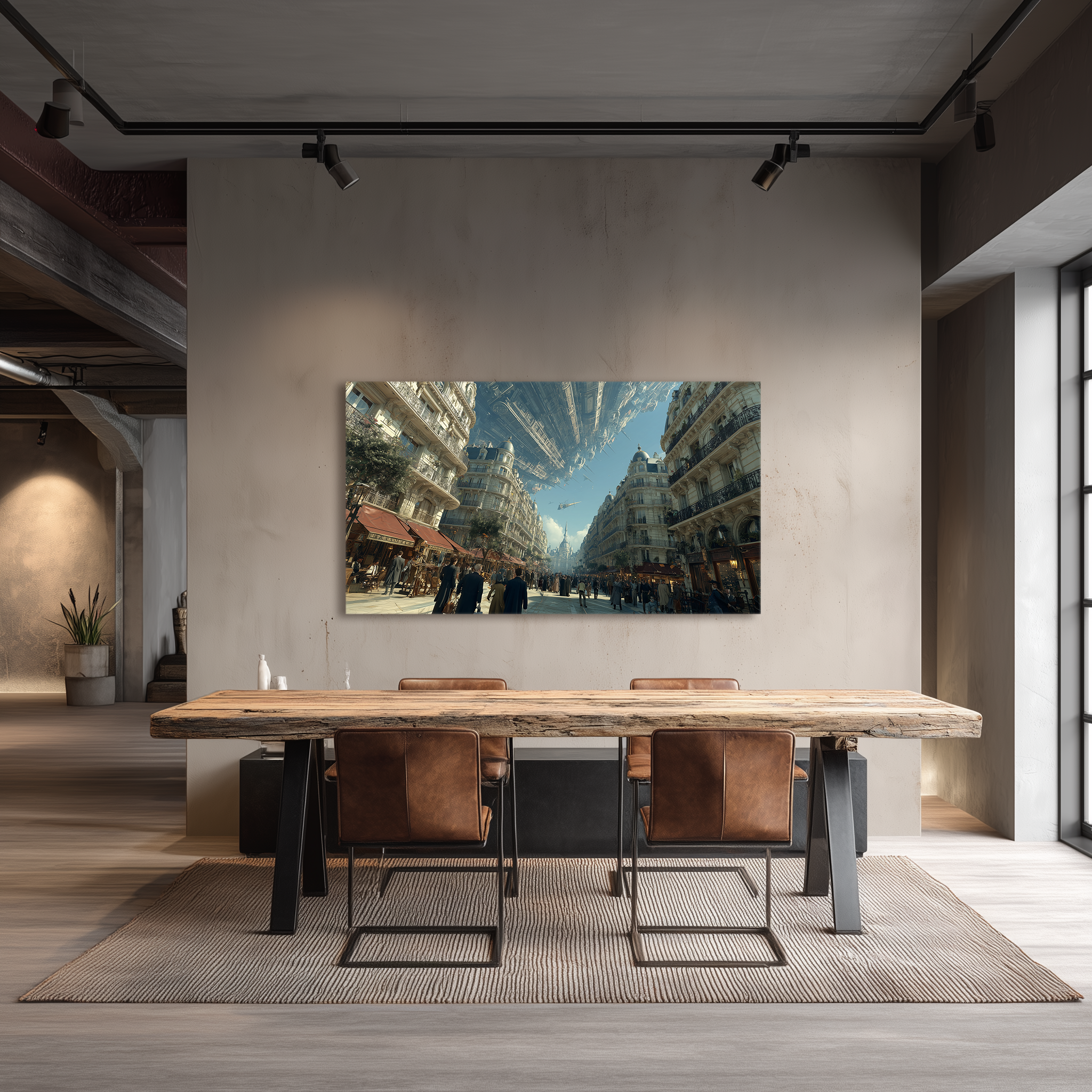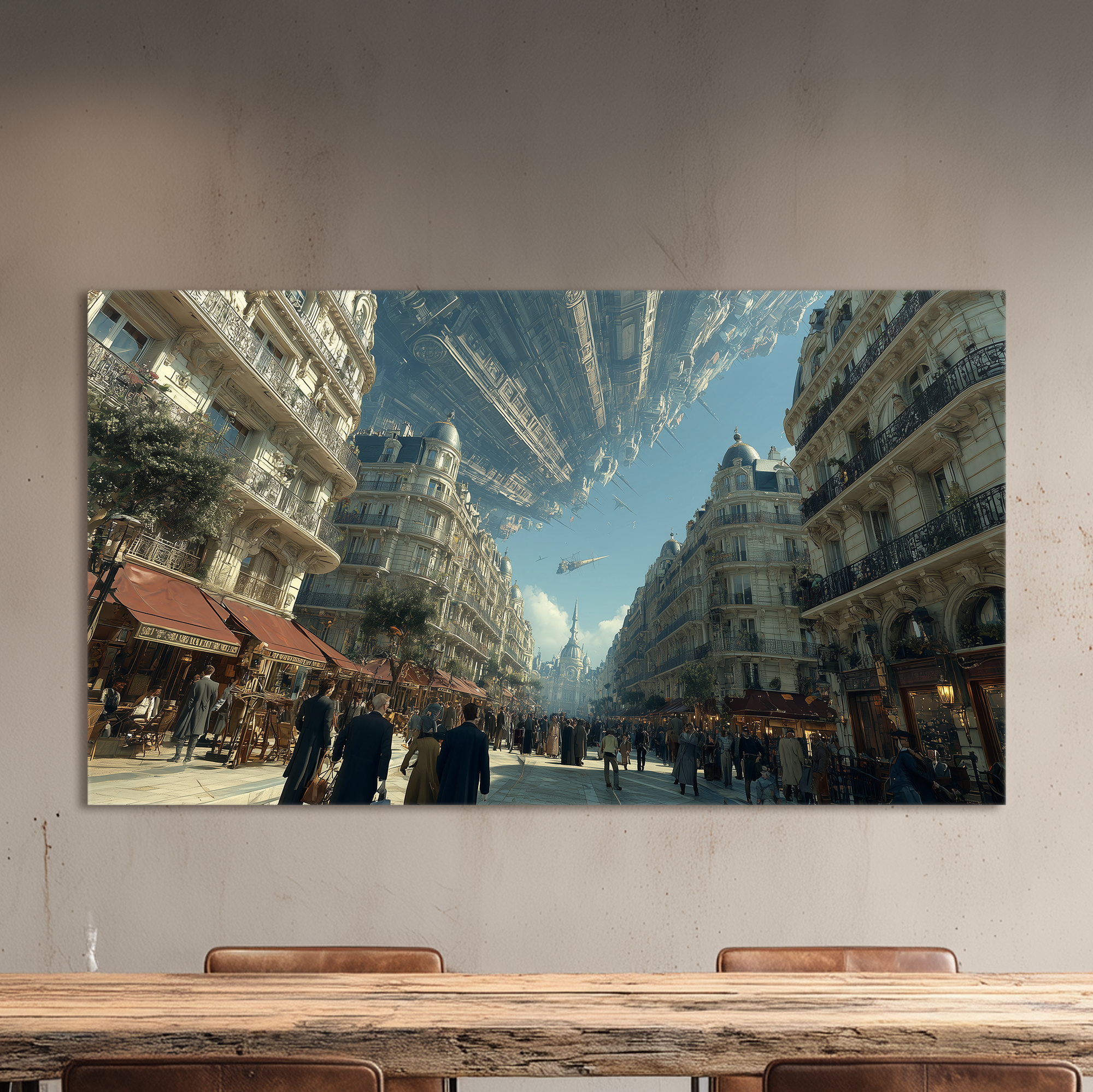 Una escena urbana cargada de contrastes entre lo histórico y lo futurista. El ambiente recuerda una película de ciencia ficción ambientada en un París alternativo, con transeúntes de época bajo una gigantesca estructura tecnológica suspendida en el cielo. Una obra con fuerte carga narrativa, ideal para espacios de conversación.