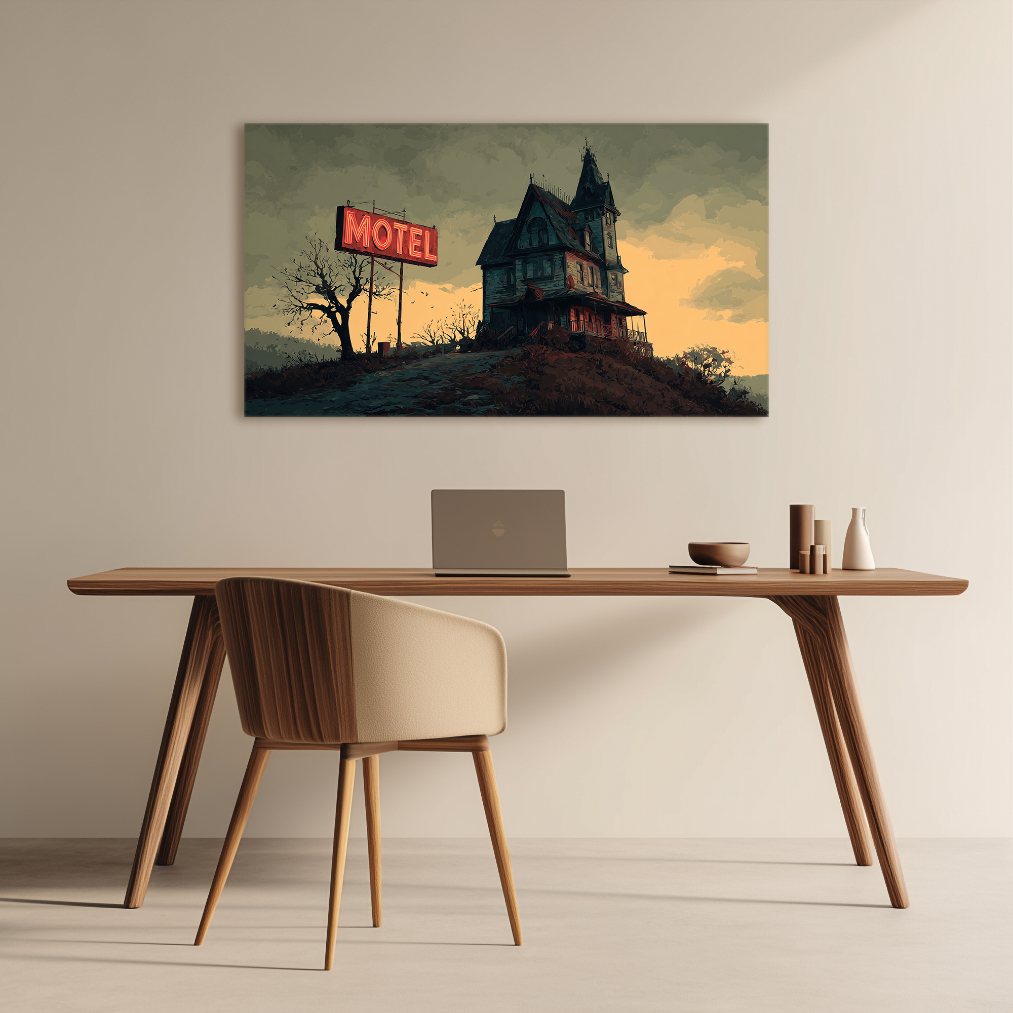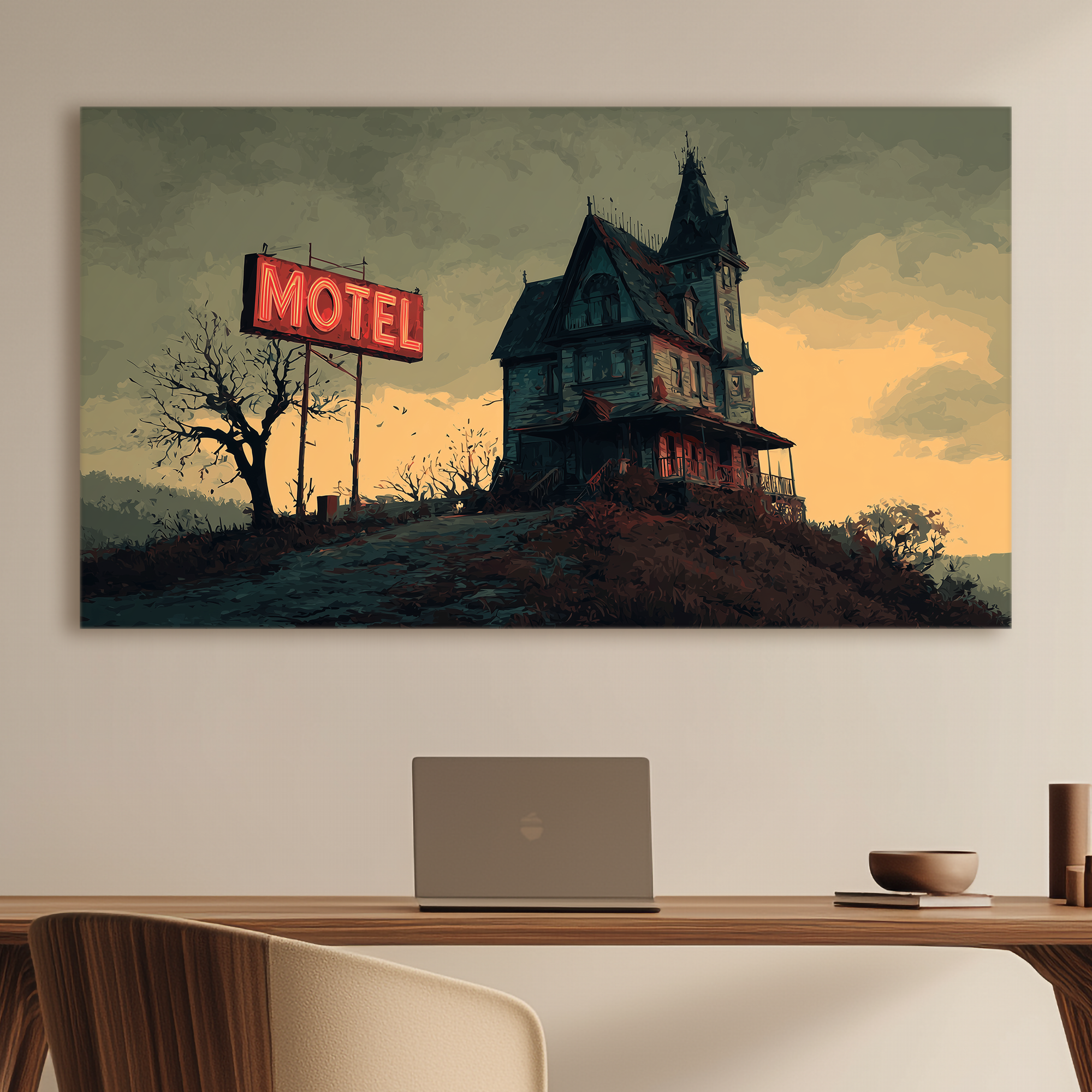 Esta obra seleccionada por BLENZO studio ofrece una mirada nostálgica al cine de terror clásico a través de una escena que combina un motel desolado con una paleta de colores crepuscular. La estética gráfica se apoya en una composición narrativa de fuerte carga atmosférica.