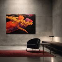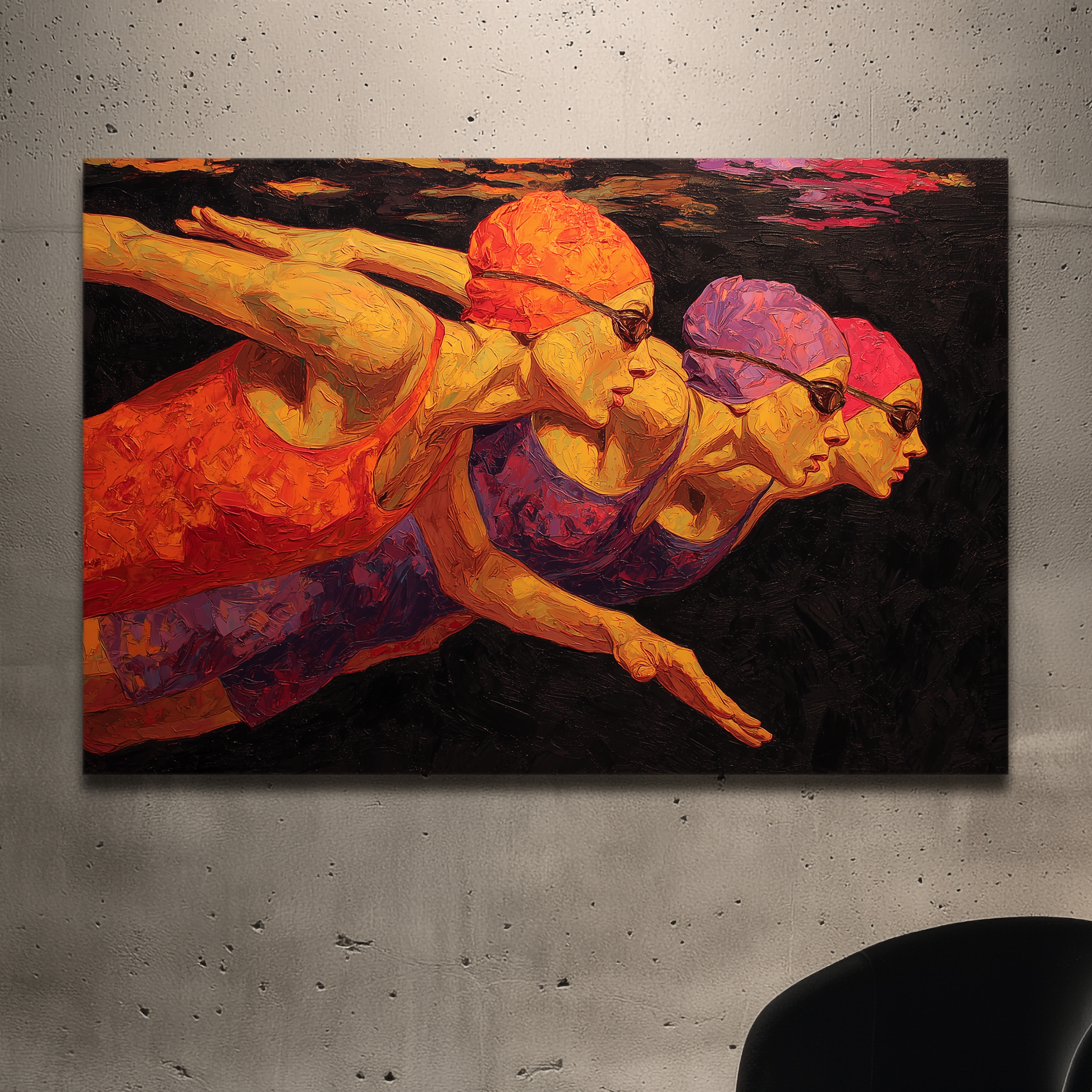 Cuatro nadadoras en perfecta sincronía subacuática forman una línea de energía contenida, retratada con pinceladas intensas y texturizadas. Esta obra de BLENZO studio captura el arte del cuerpo en movimiento con una intensidad vibrante.
