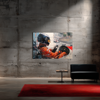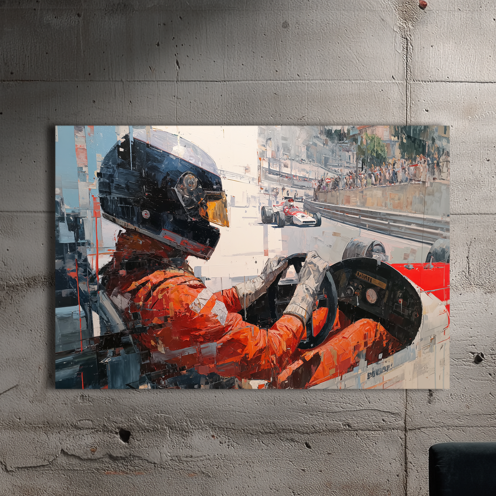 Una escena vibrante y expresiva de una carrera de Fórmula 1 pintada con una energía palpable. El piloto, capturado en plena acción desde el interior del monoplaza, transmite la tensión y la velocidad del momento. Los trazos gruesos y el color intenso refuerzan la estética pictórica. Una creación cuidadosamente seleccionada por BLENZO studio.