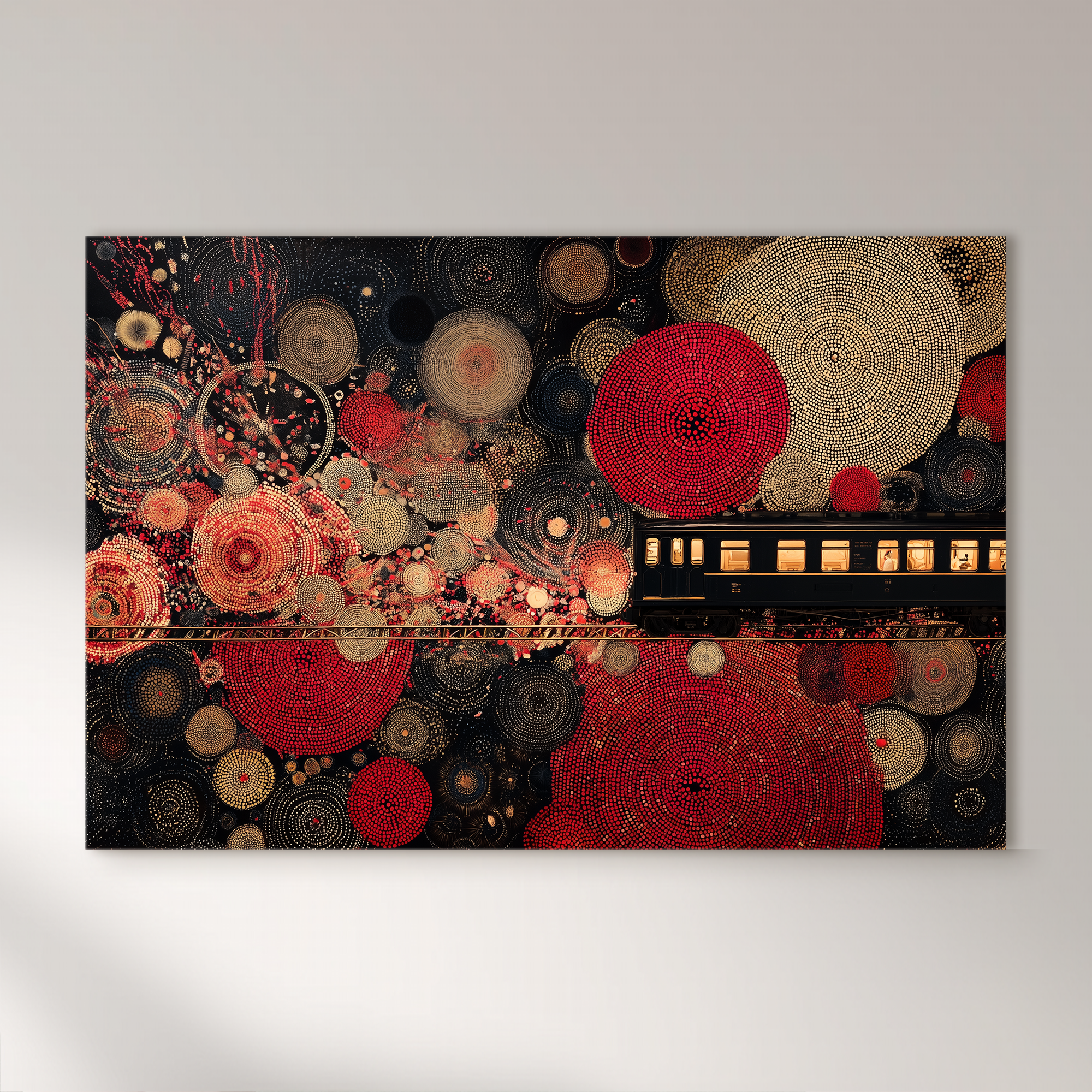 Un vagón solitario atraviesa un universo de formas circulares que recuerdan constelaciones, fuegos artificiales o células en expansión. La escena combina lo mecánico y lo poético en una atmósfera de viaje onírico. Curada por BLENZO studio, esta obra invita a imaginar travesías interiores y cosmologías visuales.