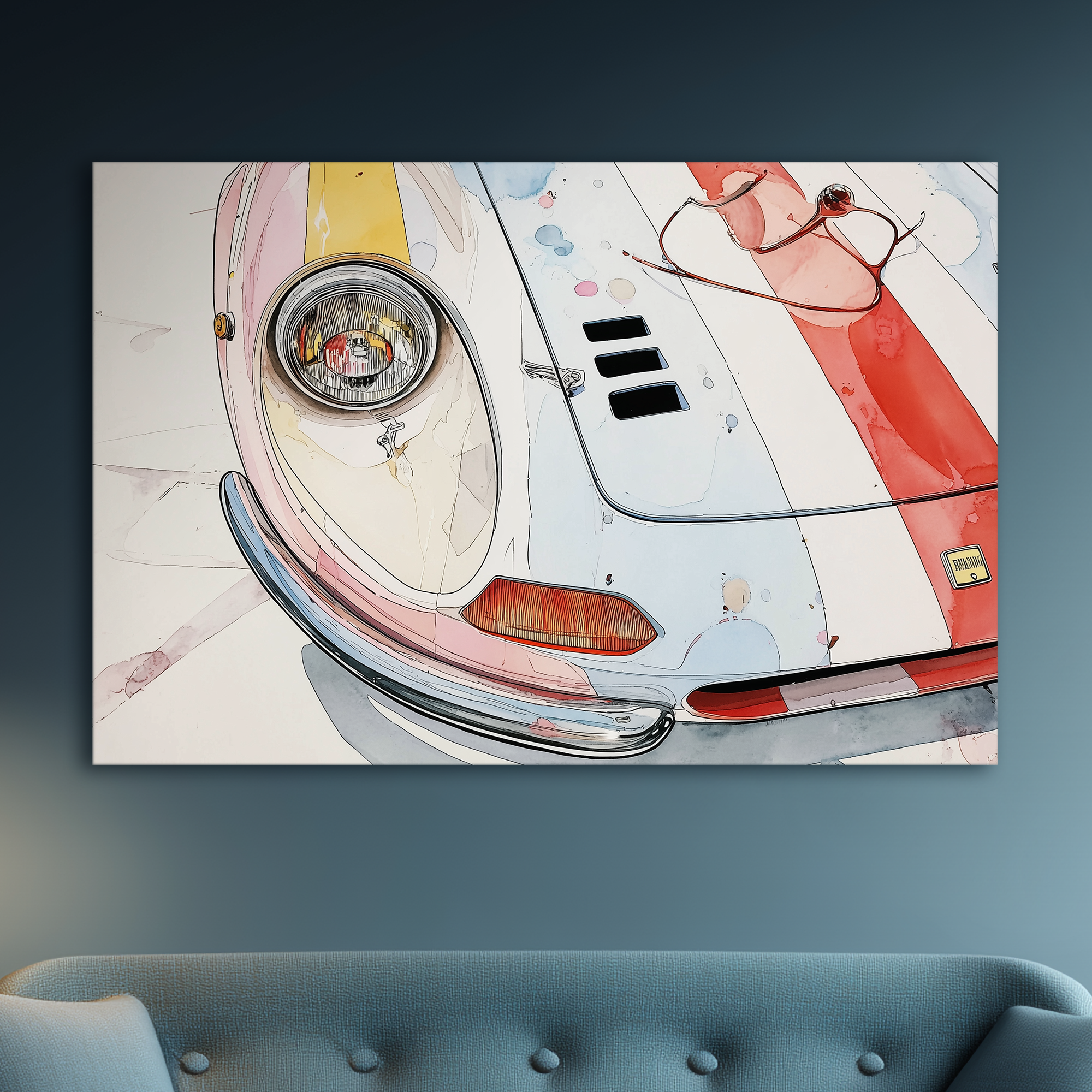 Un primer plano frontal de un coche clásico, tratado con una técnica de acuarela que combina líneas precisas y manchas de color espontáneas. Seleccionada por BLENZO studio, esta obra aporta frescura visual y sensibilidad técnica en una interpretación elegante del universo automovilístico.