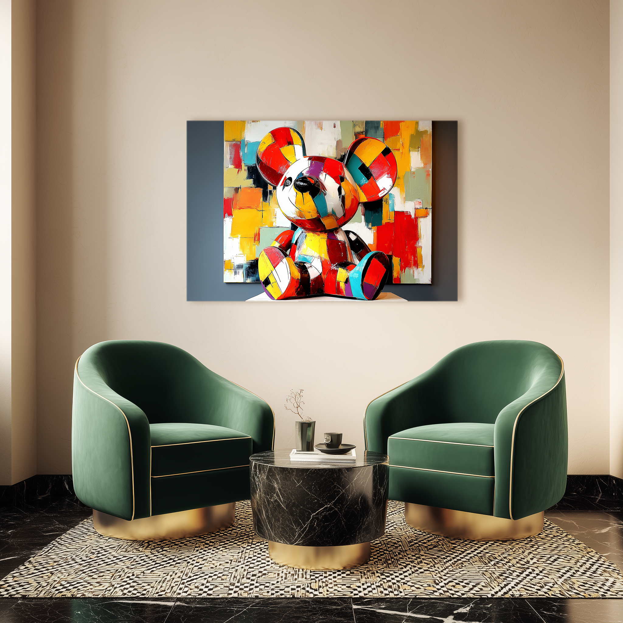 Una figura escultórica vibrante, compuesta por formas redondeadas y bloques de color, se convierte en el centro de una escena de arte pop exuberante. La energía lúdica y los ecos de lo urbano convergen en esta obra seleccionada por BLENZO studio, donde la tridimensionalidad y la paleta saturada generan un impacto inmediato.