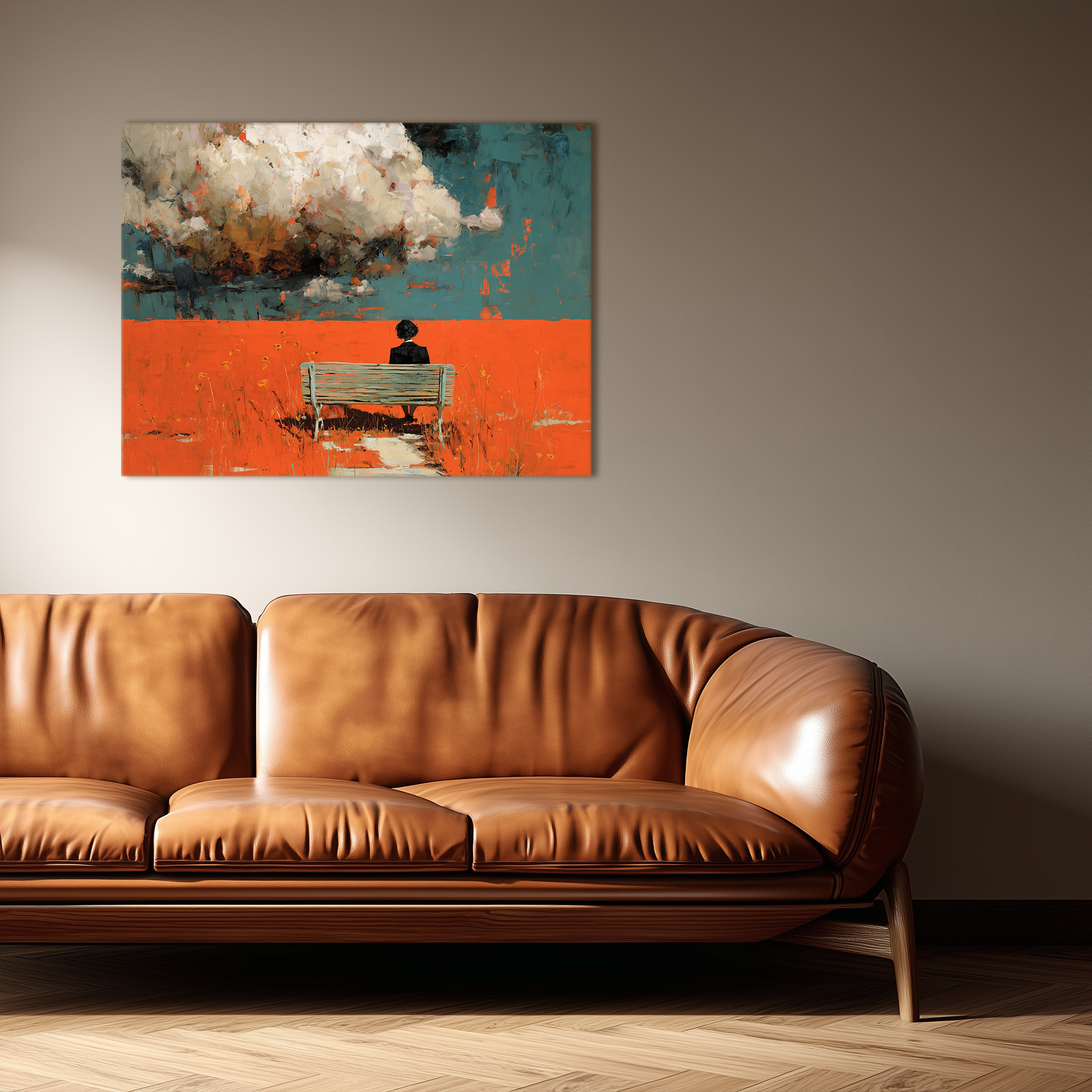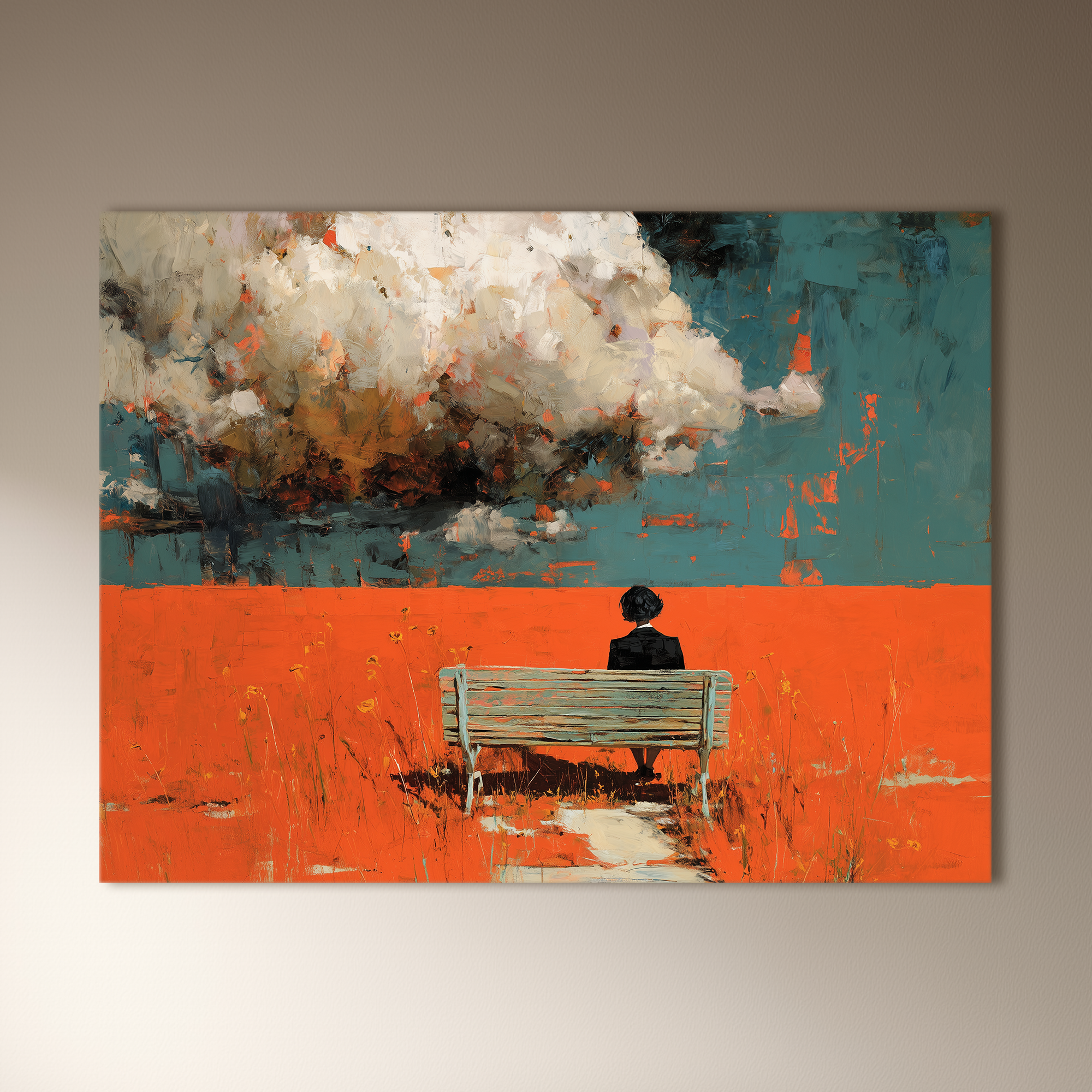 Una obra que combina el paisaje y la introspección: una figura solitaria en un banco contempla un cielo de nubes densas sobre un campo en tonos naranjas y tierras. Con pinceladas expresionistas y una atmósfera cargada de simbolismo, esta pieza de BLENZO studio invita a la reflexión sobre el tiempo y el espacio.