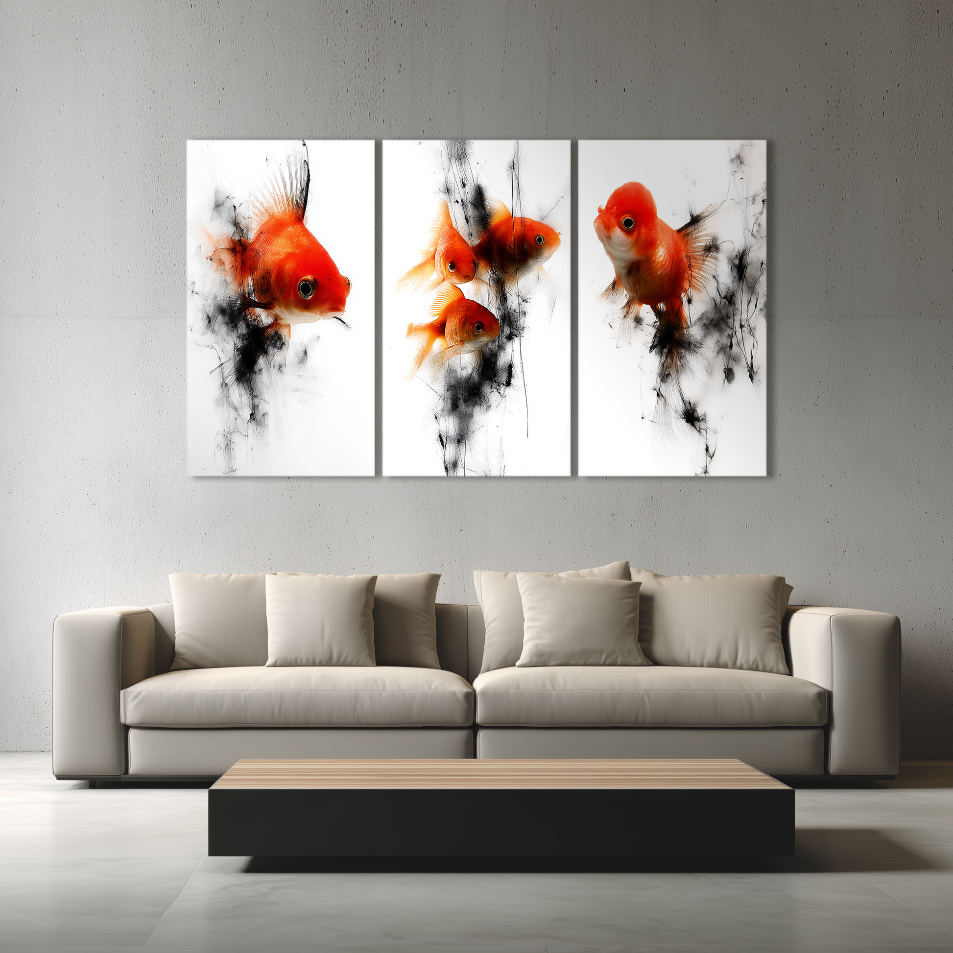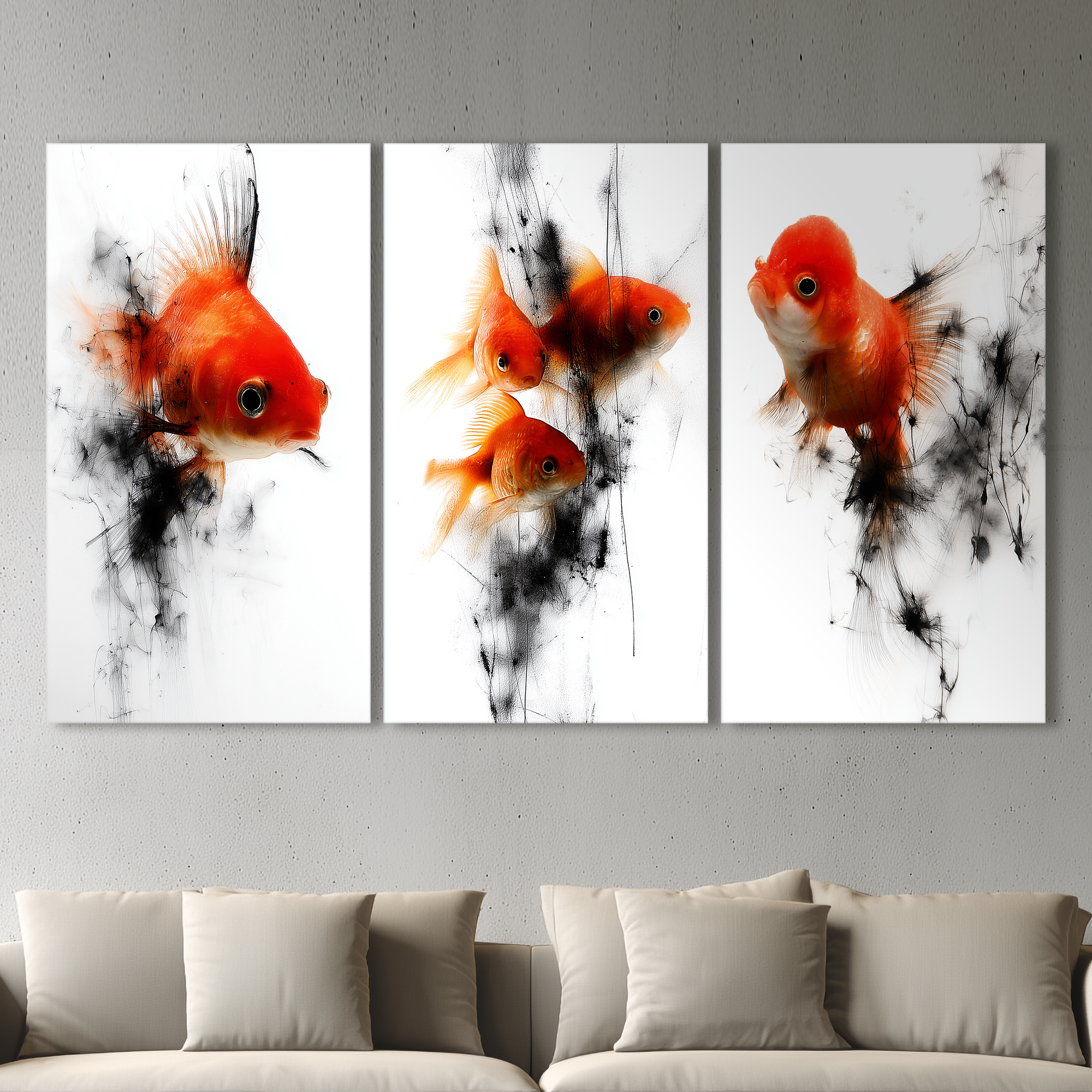 Una composición vertical que muestra un pez goldfish sobre fondo blanco, con trazos negros que se diluyen en el espacio como tinta suspendida. Seleccionada por BLENZO studio por su ligereza gráfica, su expresividad y su equilibrio visual como pieza lateral de tríptico.