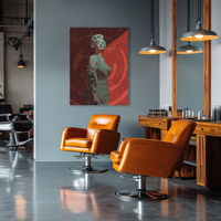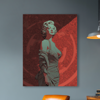 combinan el glamour dorado de los años 50 con el expresionismo gráfico contemporáneo. Una figura femenina hipnótica emerge de un fondo que evoca patrones circulares y textura ornamental, en una imagen que homenajea a los mitos del cine con estilo propio.