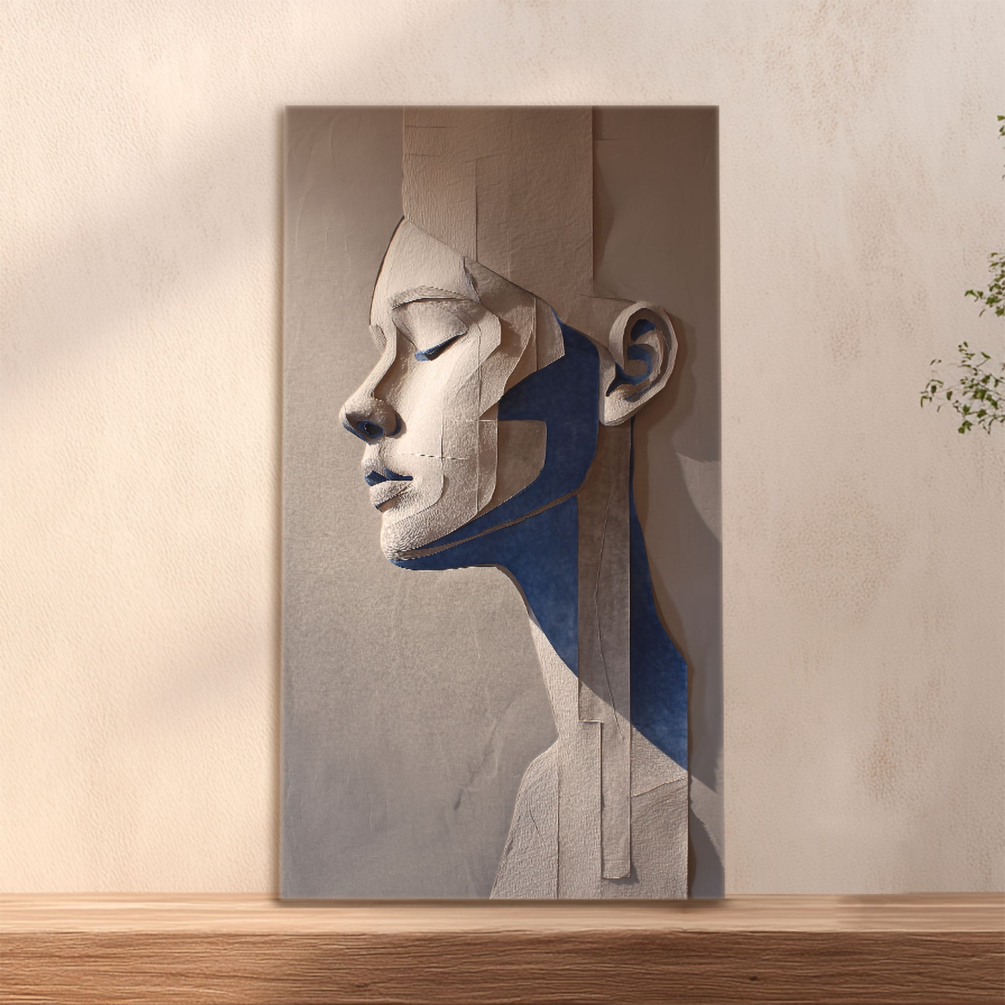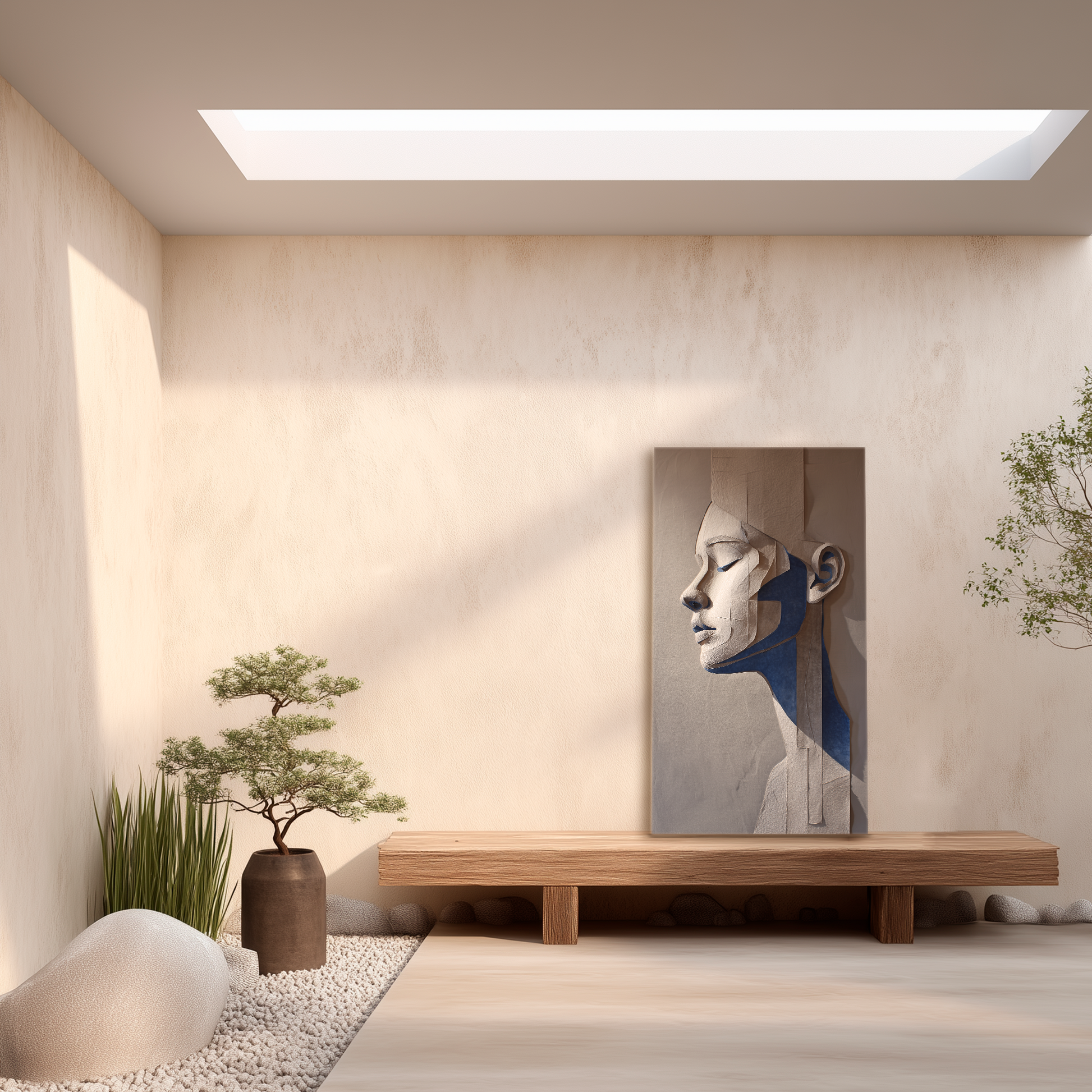Un retrato femenino construido a partir de texturas superpuestas, formas geométricas suaves y un juego sutil de relieves. La luz enfatiza el volumen escultórico de la imagen y la paleta neutra aporta serenidad. Una pieza seleccionada por BLENZO studio que destaca por su fuerza tranquila.