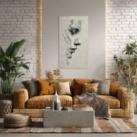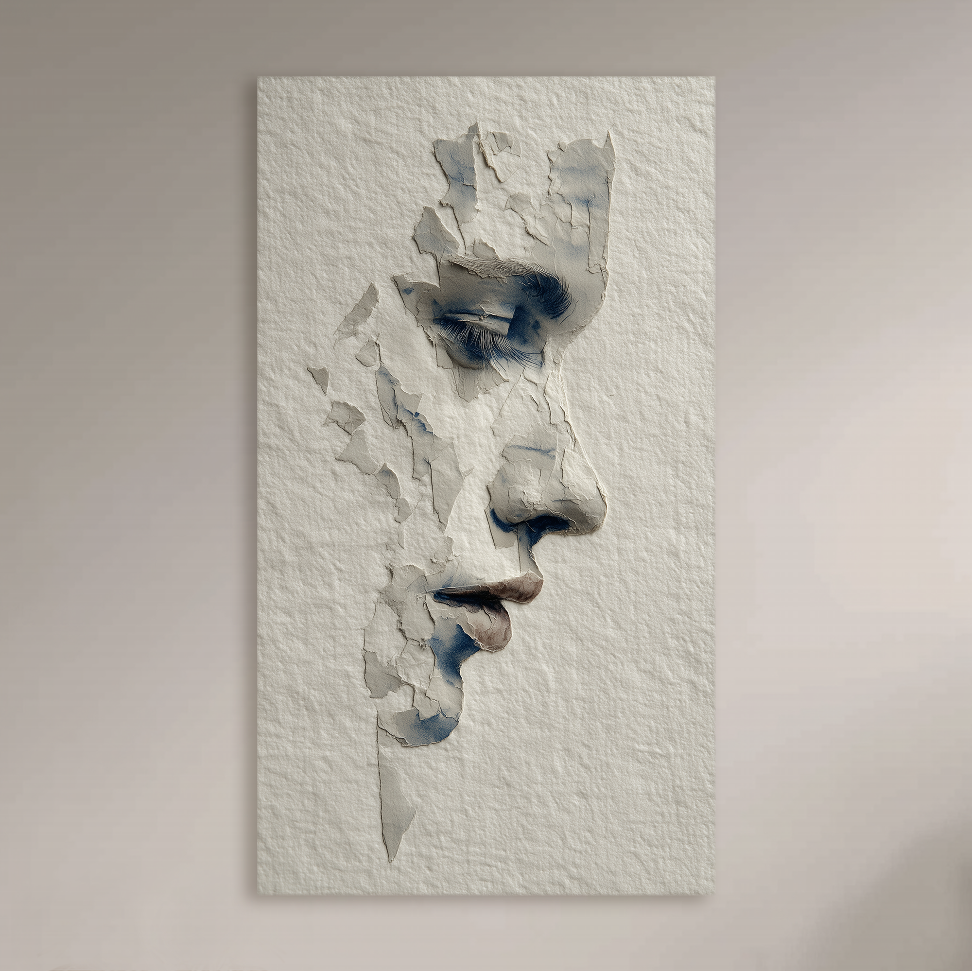 Un rostro femenino emerge entre capas de textura como si fuera esculpido en un muro antiguo. La composición, que parece desvanecerse por fragmentos, sugiere un equilibrio entre solidez y fragilidad. Una creación en la que BLENZO studio explora la poética del deterioro visual.