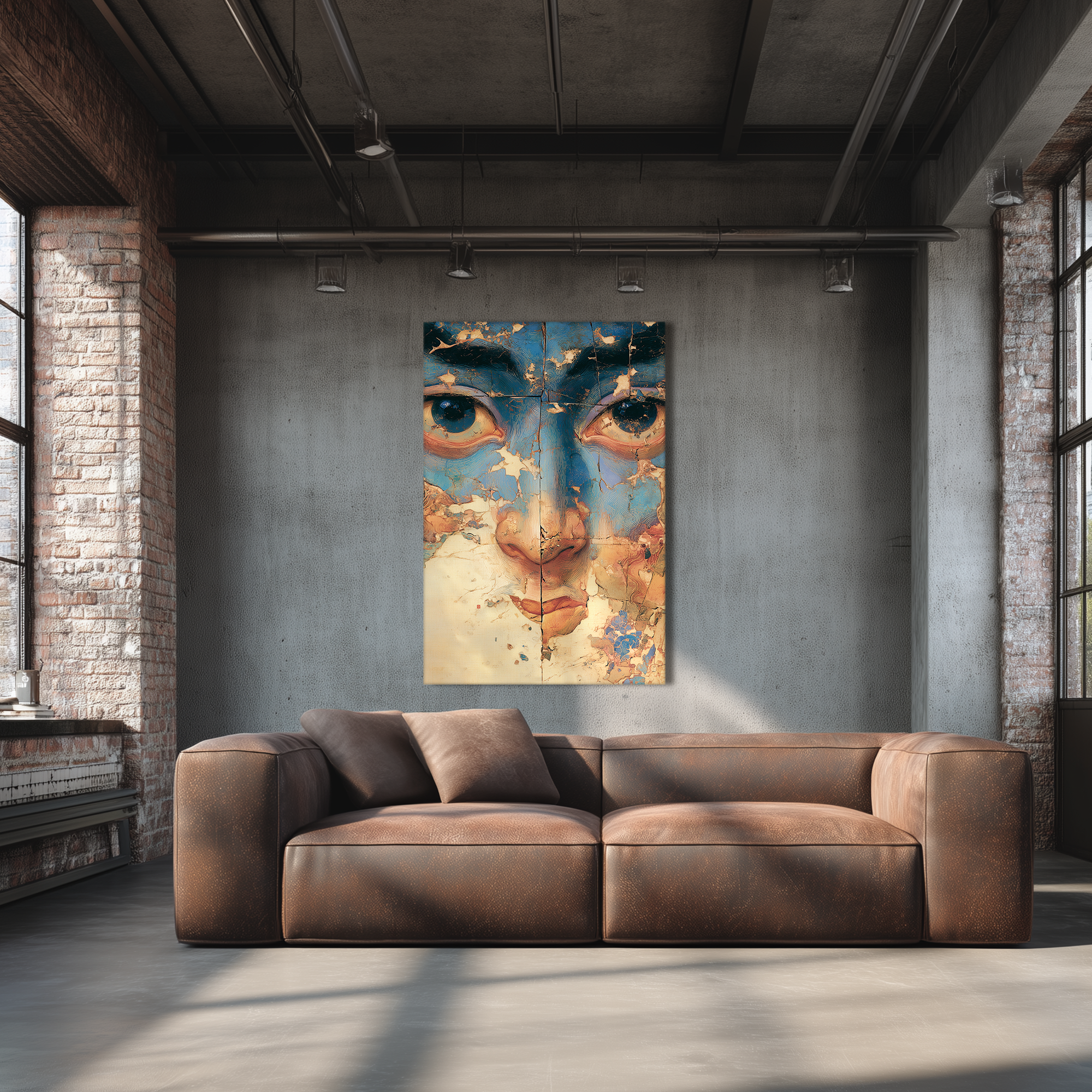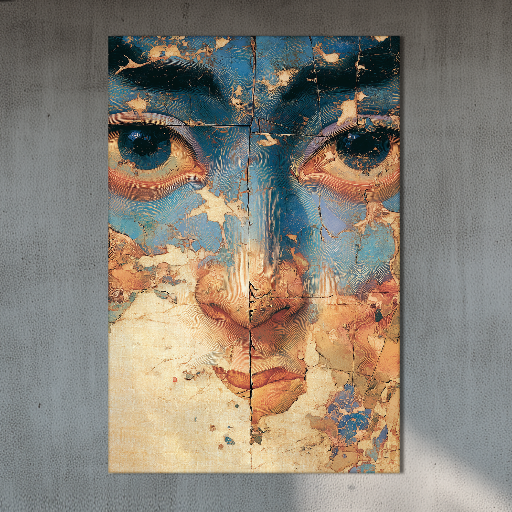 Un rostro fragmentado emerge entre grietas y texturas que evocan la pátina del tiempo. Esta composición simbólica, curada por BLENZO studio, combina lo clásico y lo digital en una exploración poética de la identidad y la memoria.