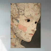 Una figura femenina de apariencia sintética emerge con expresión contemplativa en una superficie intervenida con detalles abstractos y dorados. La obra, seleccionada por BLENZO studio, combina estética robótica y sensibilidad clásica en un mismo retrato especulativo.