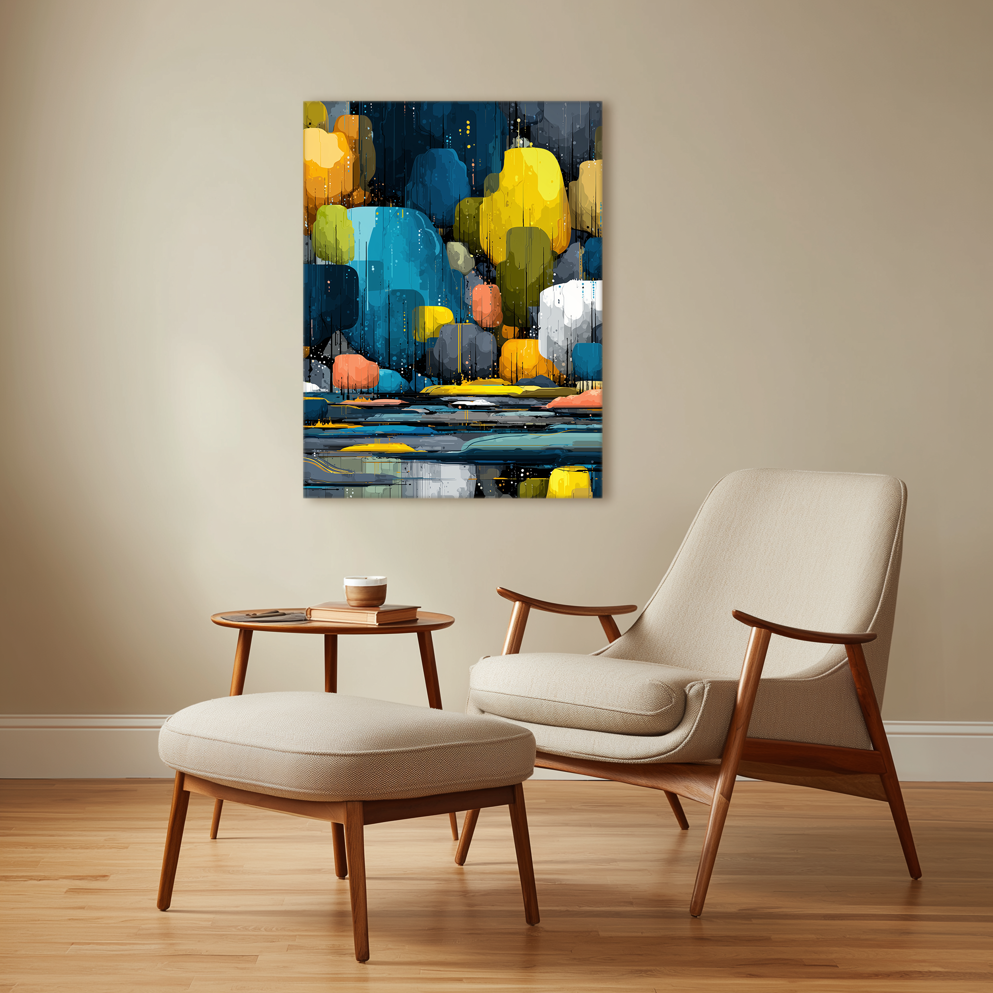 Una selva abstracta de formas geométricas y bloques de color suspendidos como si flotaran en el espacio. El juego cromático y la estructura vertical invitan a recorrer la composición como un paisaje digital expandido. Curada por BLENZO studio, esta obra ofrece una lectura lúdica, ideal para espacios que celebran el color y la energía visual.