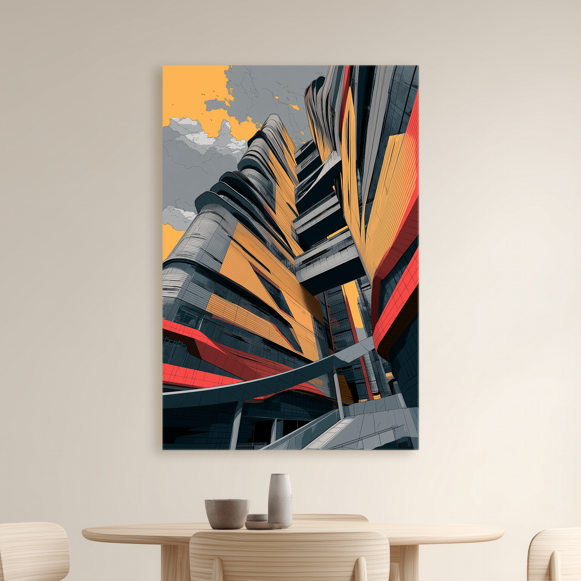 Inspirada en las formas orgánicas de la arquitectura contemporánea, esta composición gráfica transforma un rascacielos futurista en una ilustración de líneas limpias, colores saturados y dramatismo visual. Un homenaje estilizado a las estructuras imposibles.