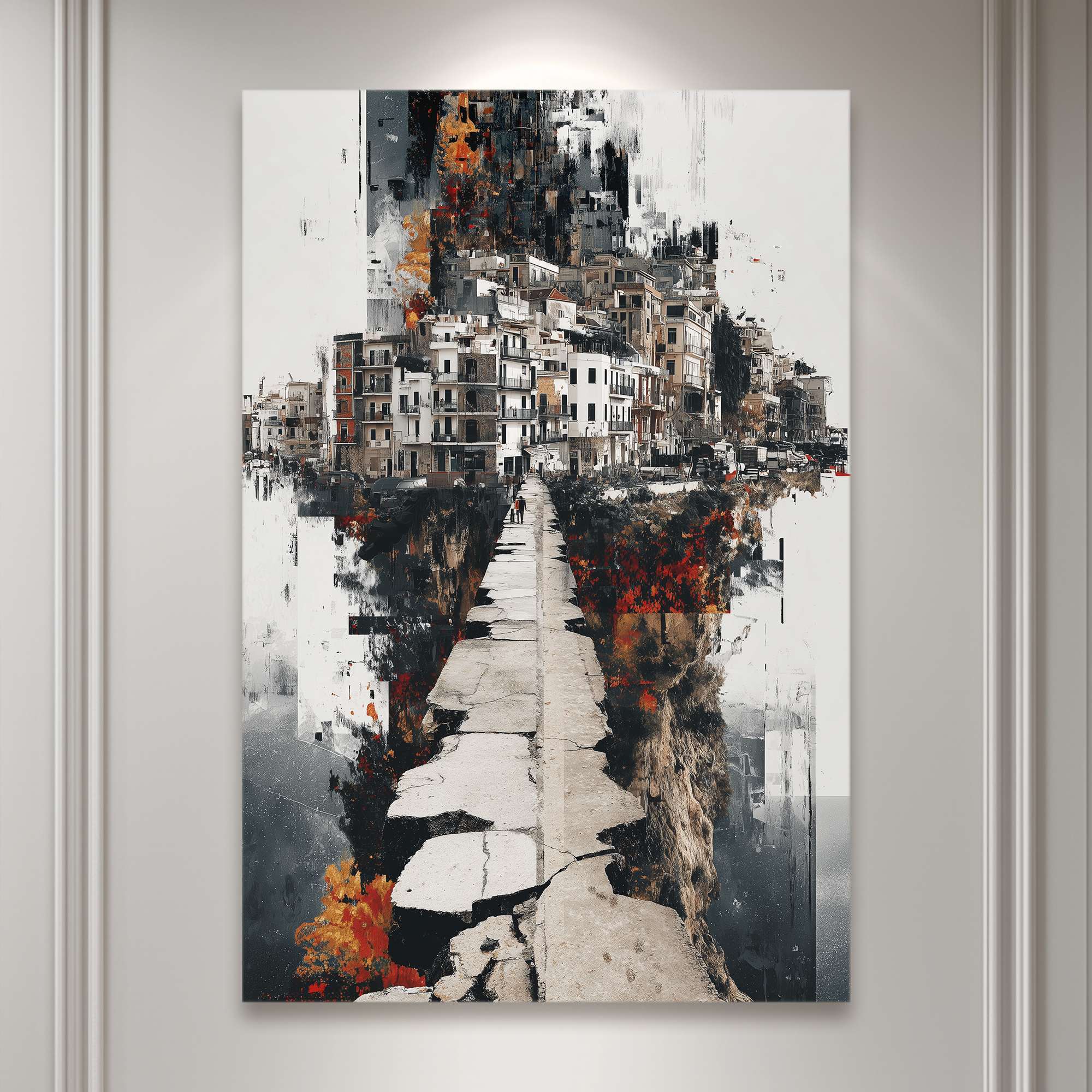 Una ciudad mediterránea fragmentada emerge entre texturas pictóricas y capas digitales, creando un paisaje urbano suspendido entre lo real y lo imaginado. La calidez de los edificios contrasta con los elementos abstractos que los rodean, en una composición cuidadosamente seleccionada por BLENZO studio.