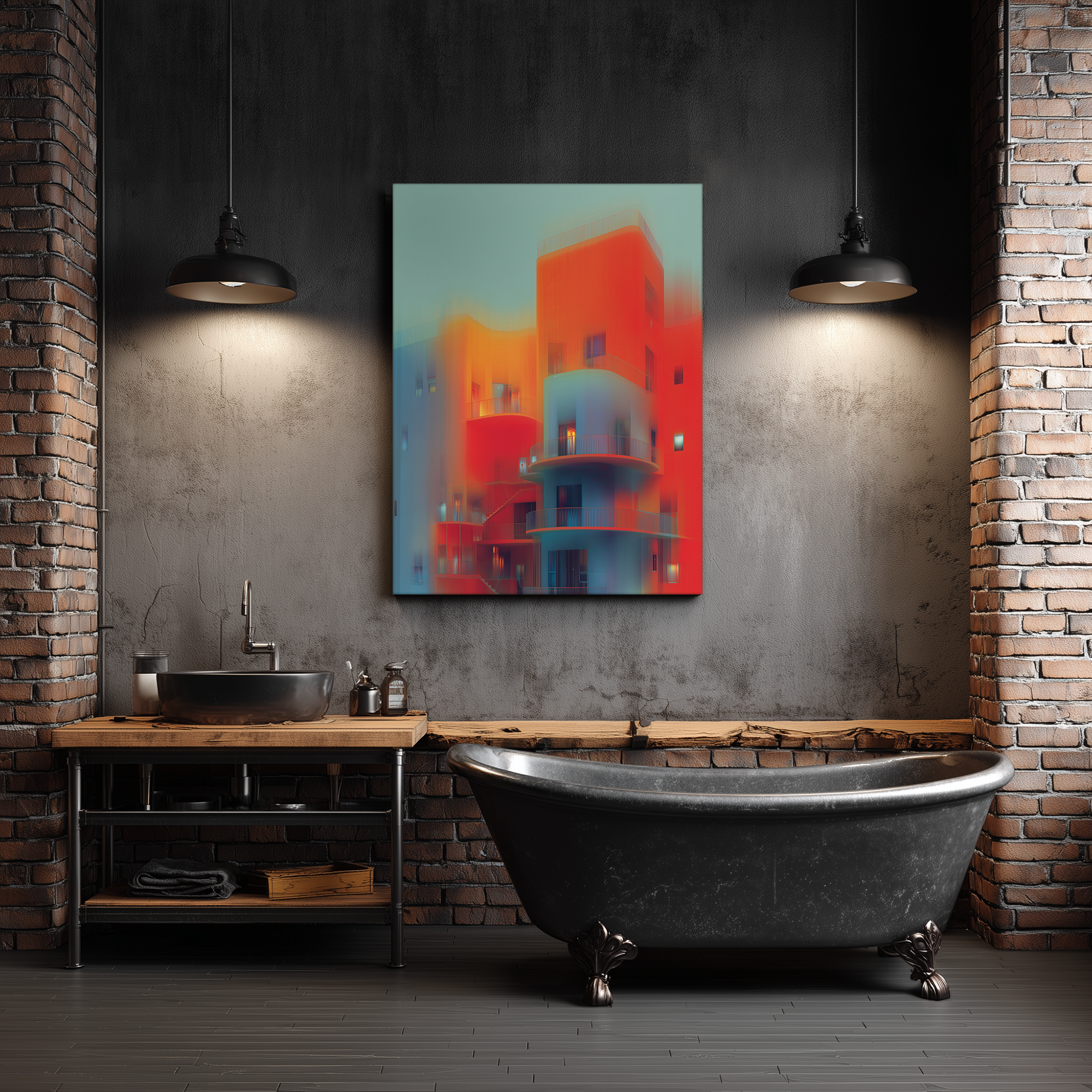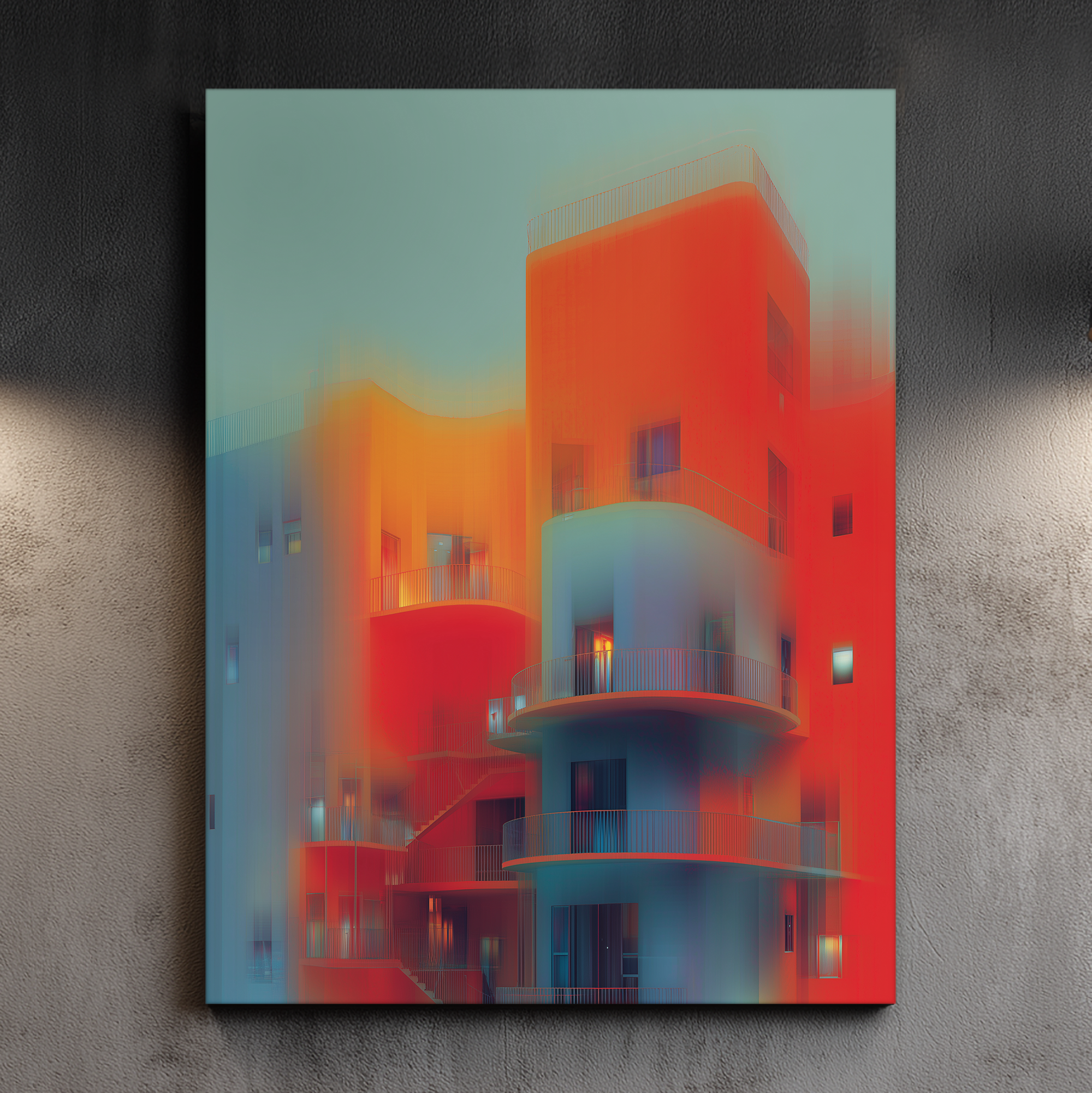 Una obra arquitectónica que combina formas suaves y volúmenes imponentes, envuelta en una atmósfera cromática vibrante que oscila entre lo etéreo y lo urbano. La composición, con sus transiciones de color y juego de transparencias, crea una sensación de movimiento y modernidad. Una pieza audazmente seleccionada por BLENZO studio.