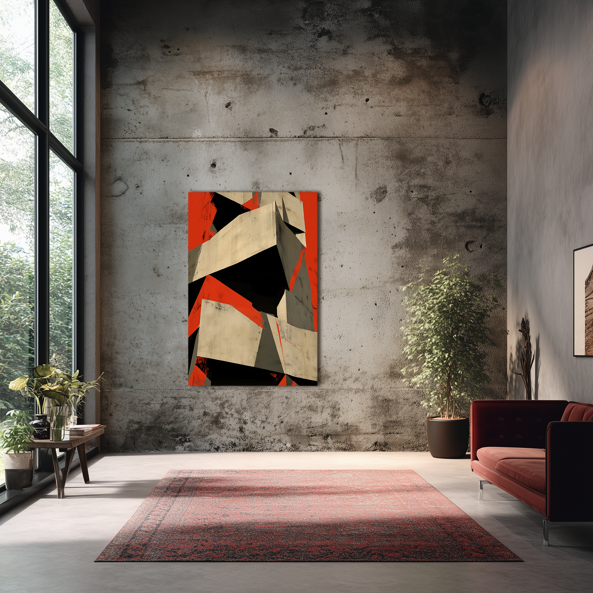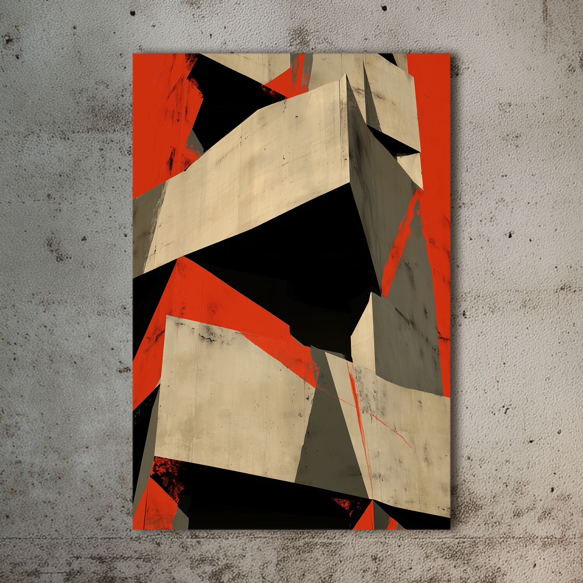 Capas de concreto se entrelazan con manchas rojas como si una estructura brutalista emergiera de una pintura. Esta obra, seleccionada por BLENZO studio, proyecta fuerza, geometía y expresión pura.