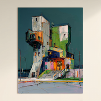 Una estructura vibrante que desafía la simetría urbana mediante planos inclinados, bloques de color y una disposición aparentemente caótica. La obra, seleccionada por BLENZO studio, se presenta como una metáfora arquitectónica de la libertad formal y la expresión lúdica. El tratamiento pictórico refuerza su carácter artístico, fusionando arquitectura e ilustración.