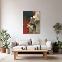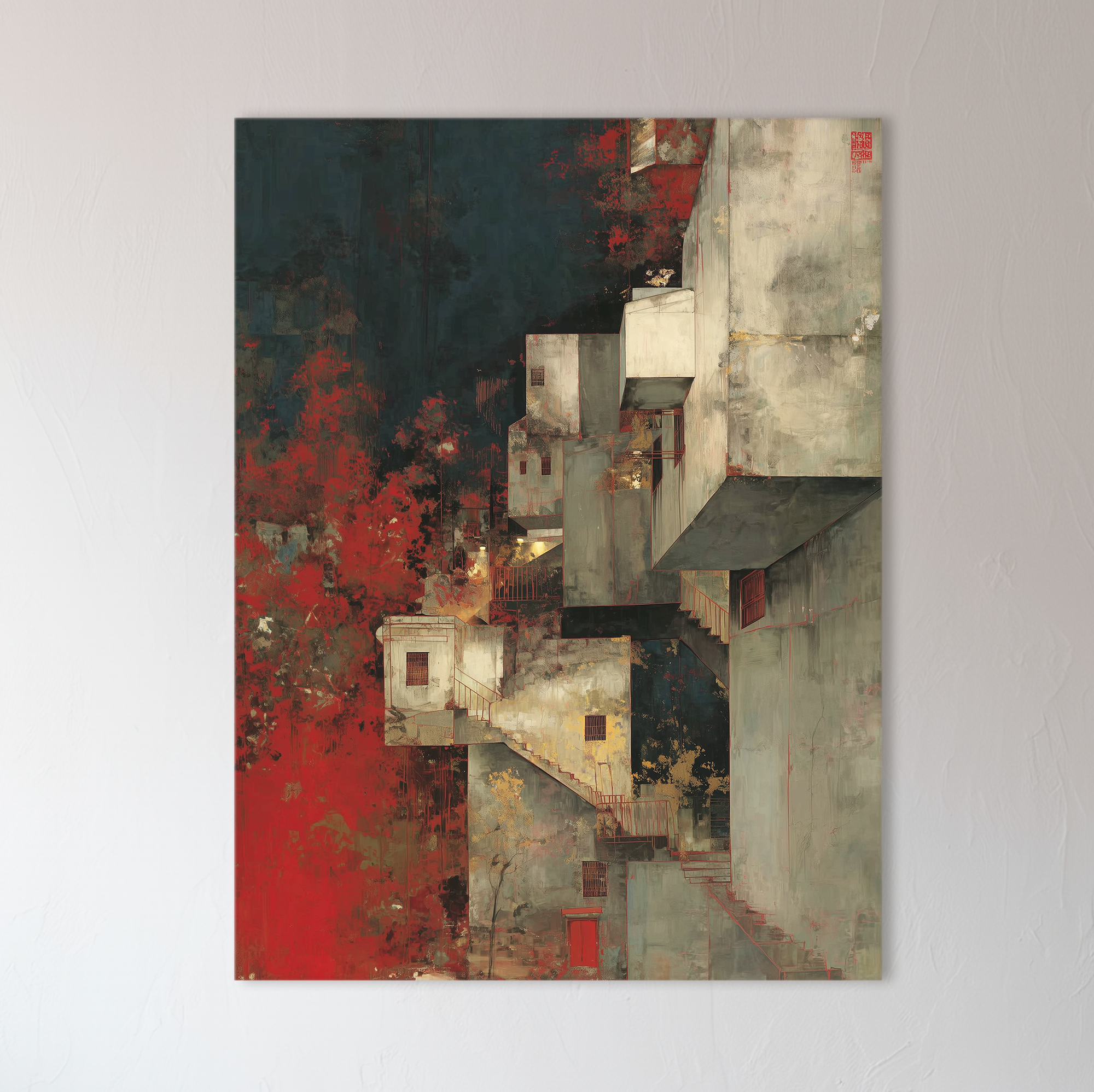 Una composición vertical en la que bloques arquitectónicos emergen desde un paisaje onírico marcado por tonos rojos y oscuros. Escaleras imposibles, sombras profundas y texturas pictóricas construyen una narrativa suspendida entre lo real y lo imaginado. Esta pieza, seleccionada por BLENZO studio, reinterpreta la arquitectura desde una sensibilidad poética.