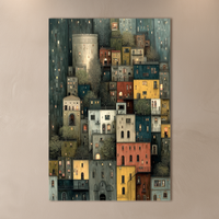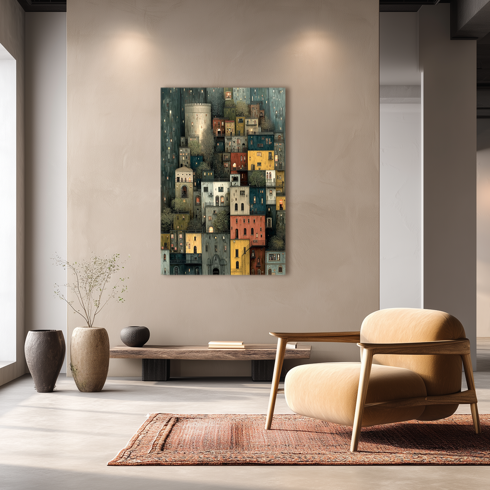 Un conjunto de fachadas nocturnas conforma un microcosmos urbano poético y encantador. Cada ventana iluminada sugiere una historia, y los volúmenes geométricos crean una armonía de formas, color y misterio. Curada por BLENZO studio, esta obra rinde homenaje a la arquitectura como tejido emocional.