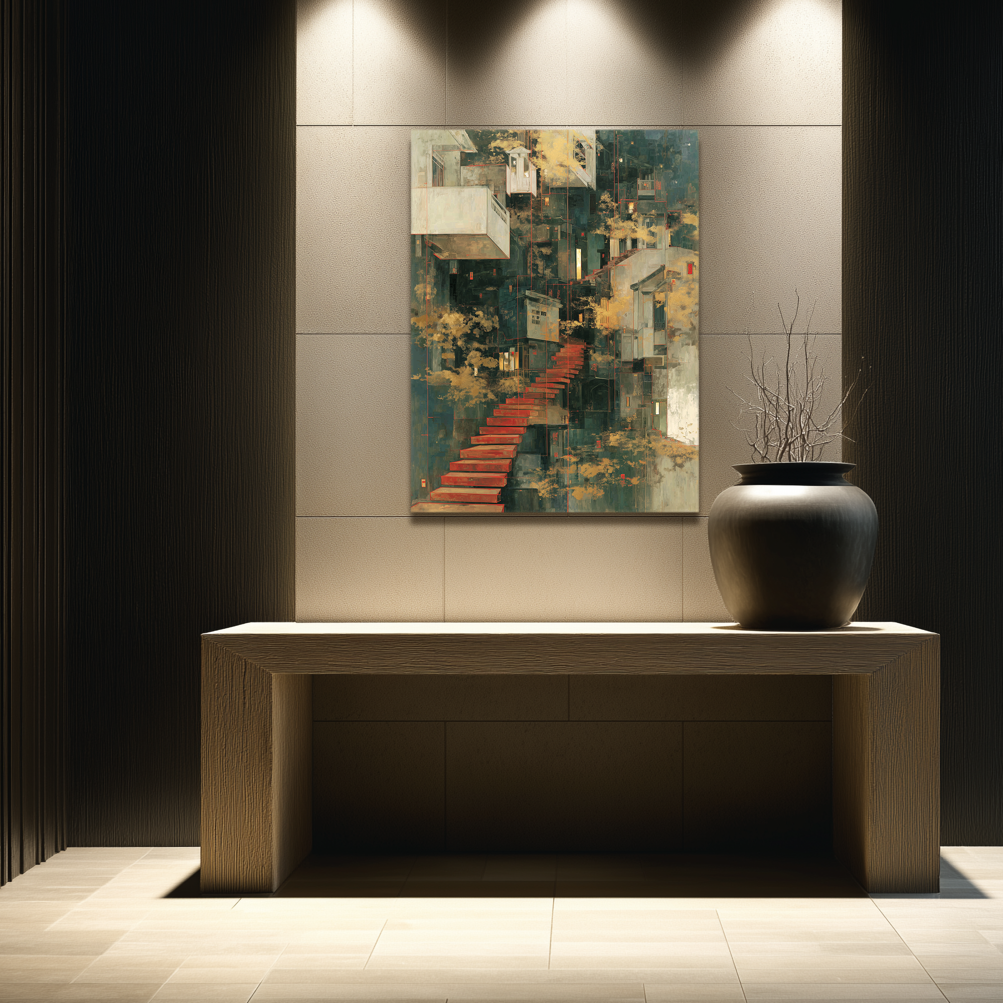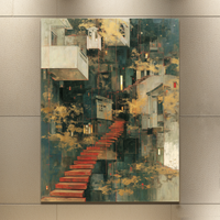 Una escalera flotante en rojo intenso serpentea entre fachadas densas y elementos arquitectónicos suspendidos, creando una atmósfera onírica y teatral. BLENZO studio presenta una obra que explora la verticalidad desde un enfoque simbólico y espacial.