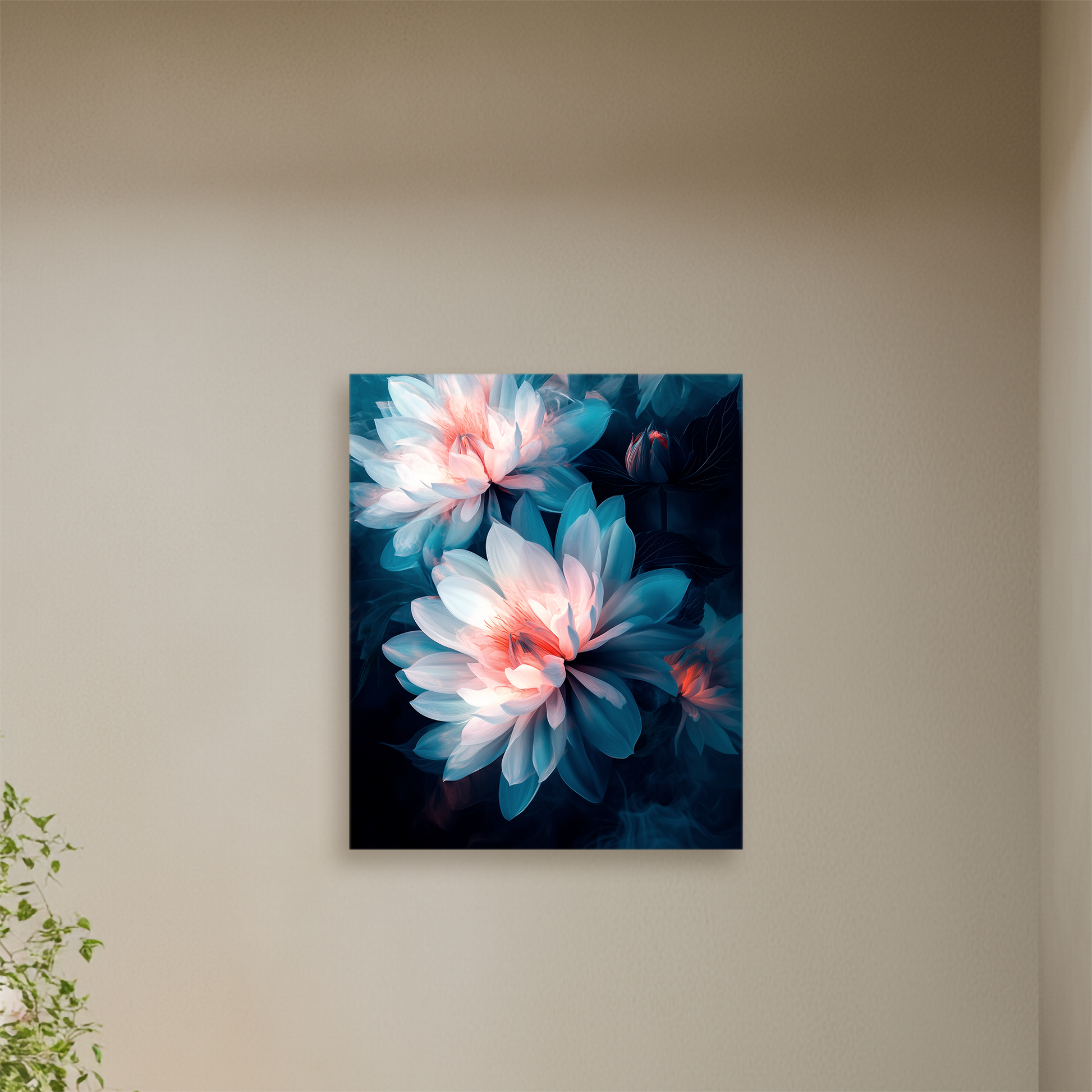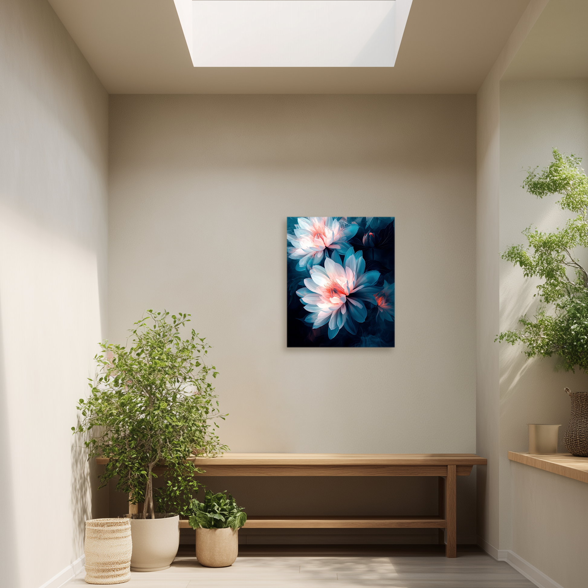Flores luminosas envueltas en una atmósfera onírica, donde los pétalos parecen emerger del fondo oscuro como reflejos de una ensoñación. Una pieza botánica de alto impacto visual y suave energía que conecta con el imaginario floral más etéreo. Una creación de BLENZO studio.