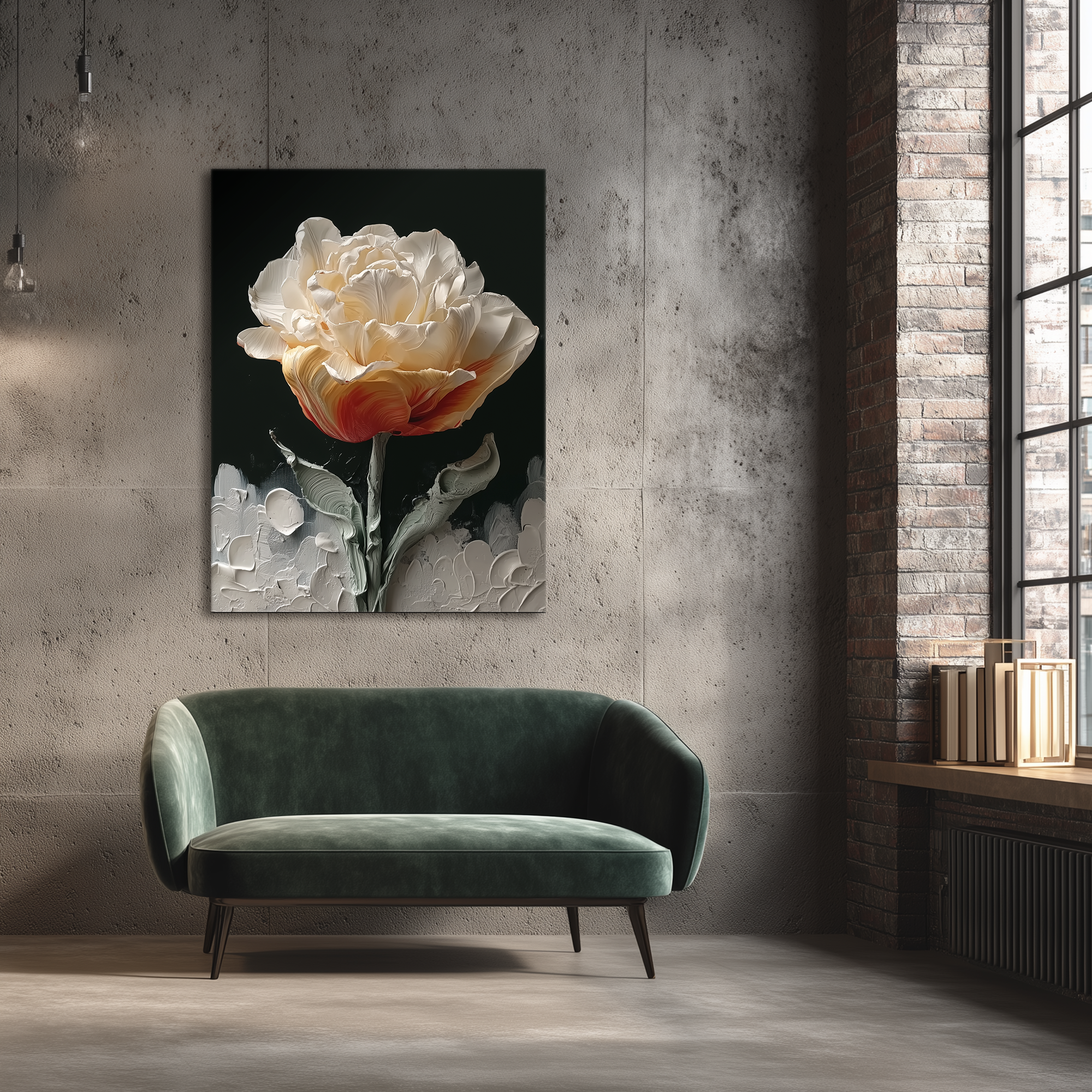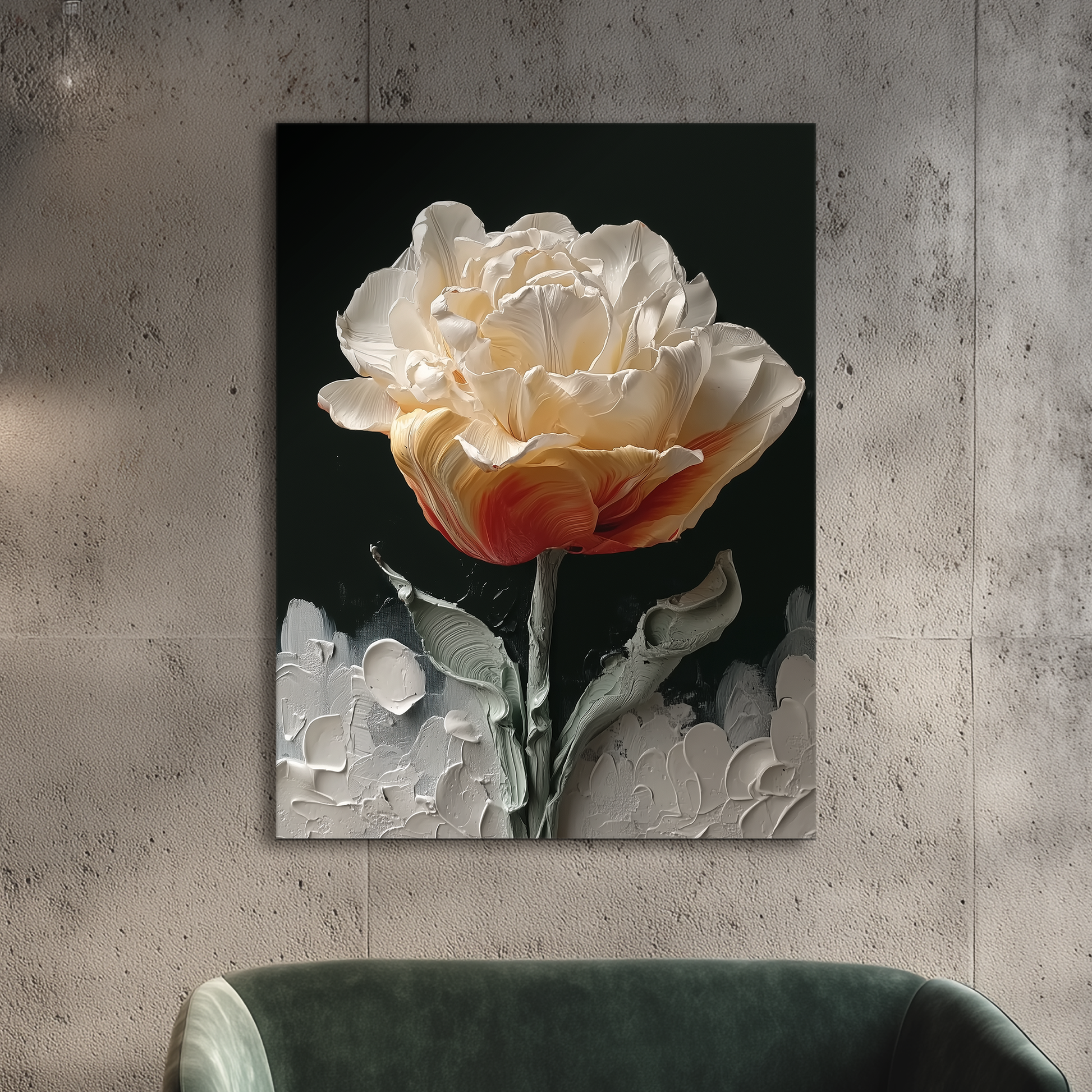 Un retrato floral de gran fuerza matérica, donde los pétalos parecen esculpidos con espátula sobre fondo negro. Esta creación de BLENZO studio transmite emoción a través de la textura, la luz y la precisión del color.