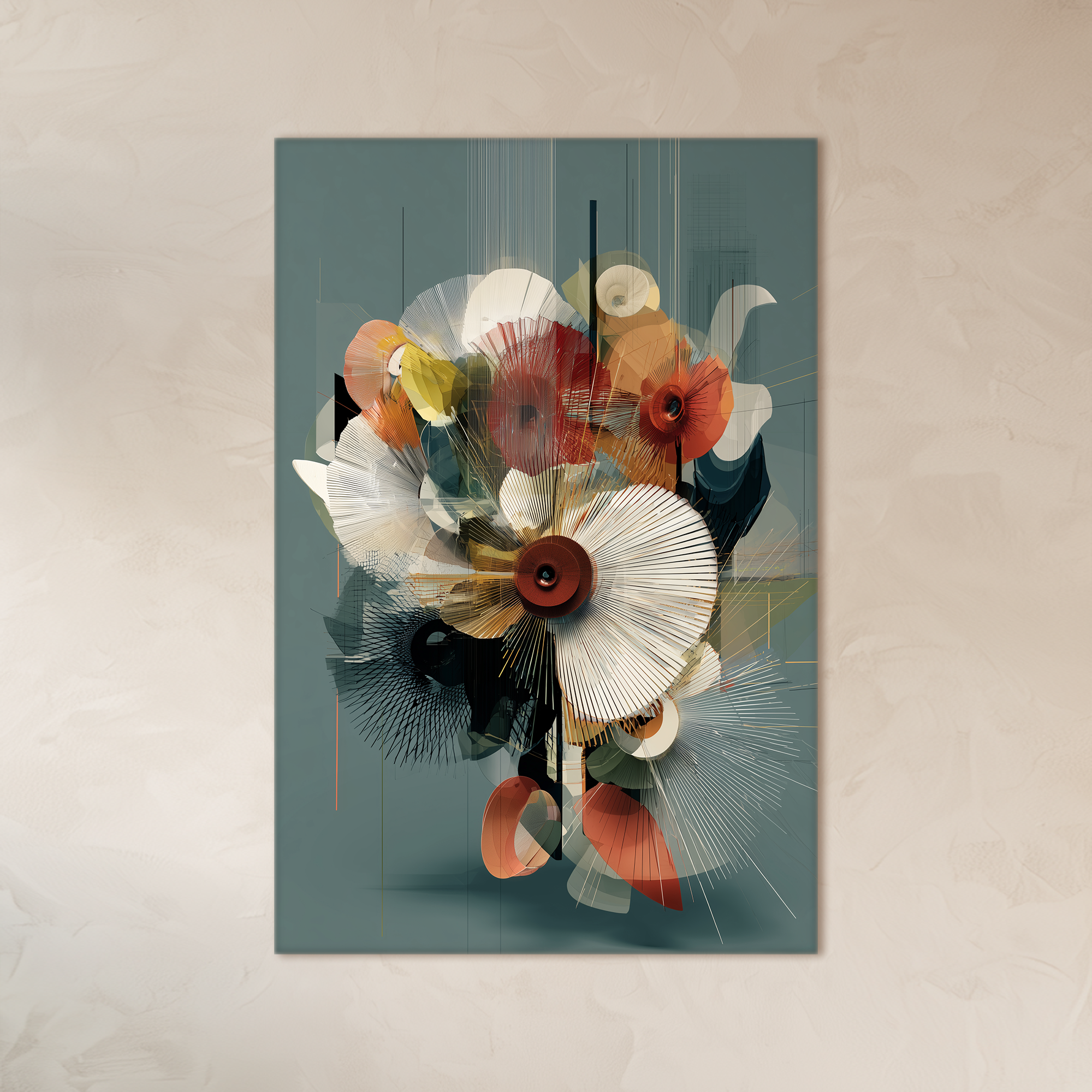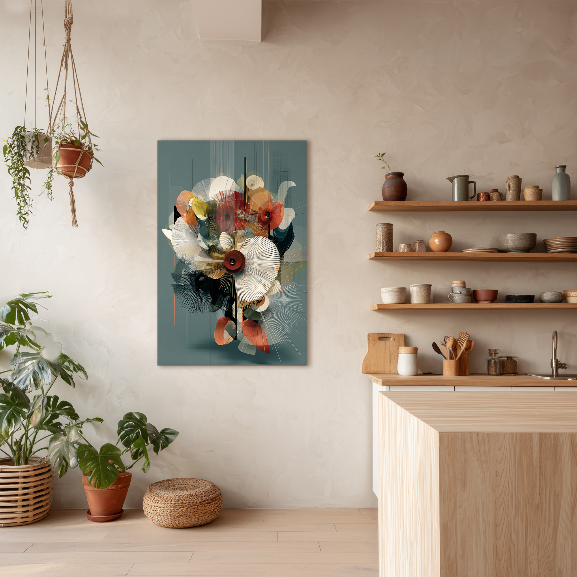 Una explosión de formas geométricas y motivos orgánicos que se entrelazan en una composición floral abstracta. Las líneas finas y los tonos cálidos, combinados con matices neutros, generan un equilibrio entre lo estructurado y lo espontáneo. Una obra audaz y cuidadosamente seleccionada por BLENZO studio, que conecta el lenguaje del diseño con la sensibilidad artística.