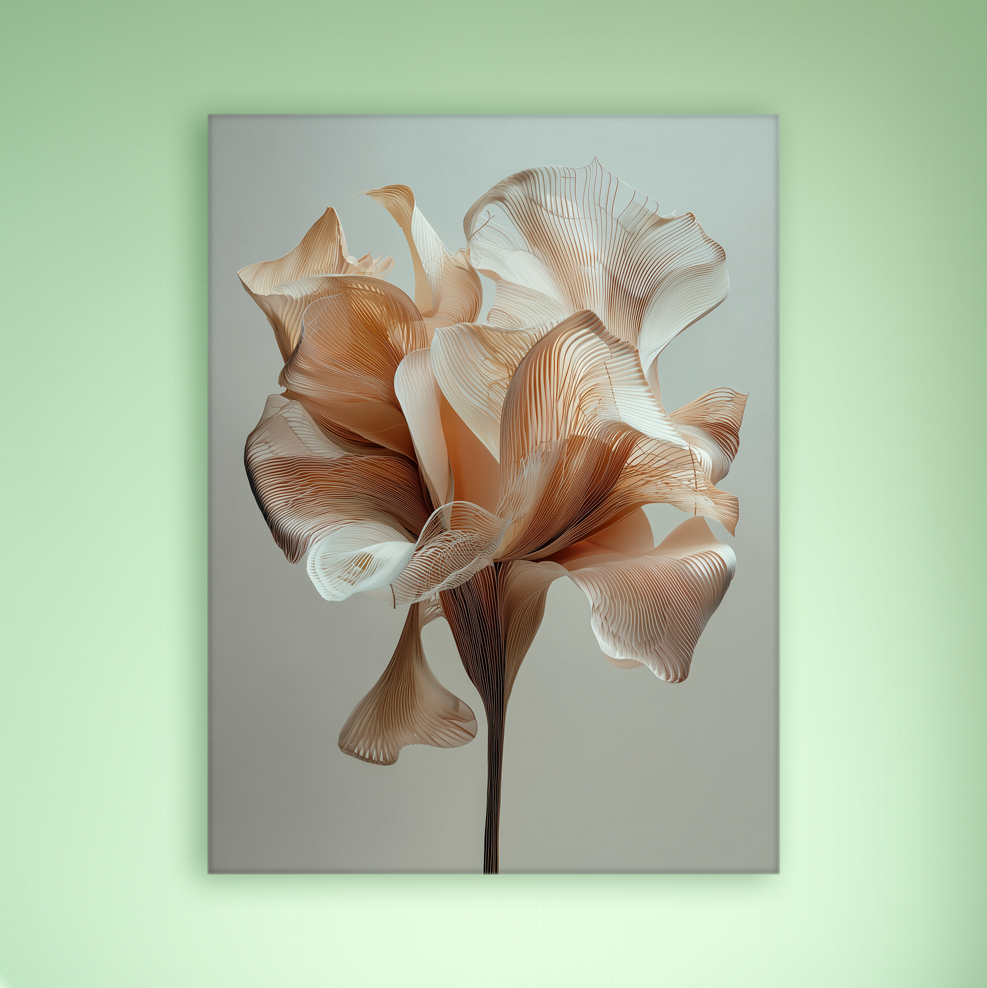 Un estudio botánico digital de líneas curvas que recuerda a una escultura textil suspendida. Esta flor especulativa, hecha de filamentos orgánicos y suaves transiciones tonales, respira ligereza y sofisticación. Curada por BLENZO studio, la pieza mezcla la fragilidad natural con una estética contemporánea de alta precisión.
